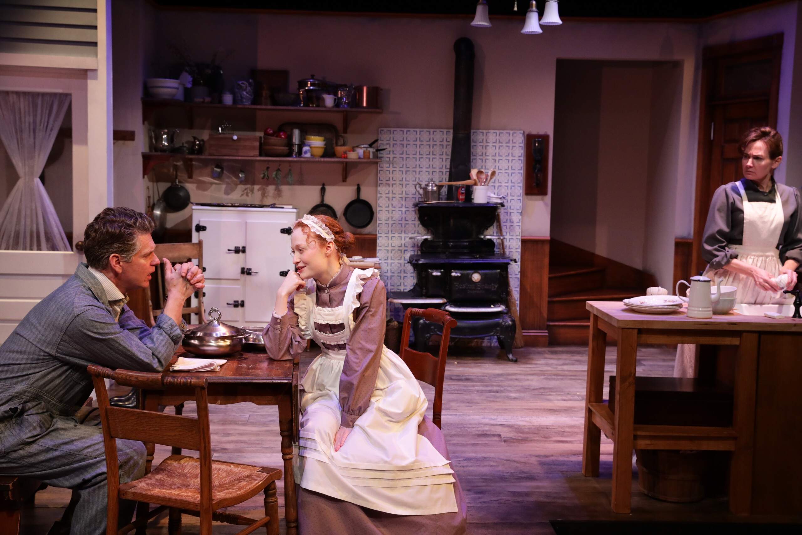 These three people — minor characters mentioned in Eugene O’Neill’s autobiographical play “Long Day’s Journey into Night,” — are fully fleshed out in a terrifically acted “Thirst,” at the Lyric Stage Company through March 17. The action takes place in the Tyrone family kitchen designed by Janie E. Howland (a realistic one outfitted with a coal-black wood-burning stove on which they cook bacon and eggs) a white fridge, shelving, and a working sink with butcher block counters.