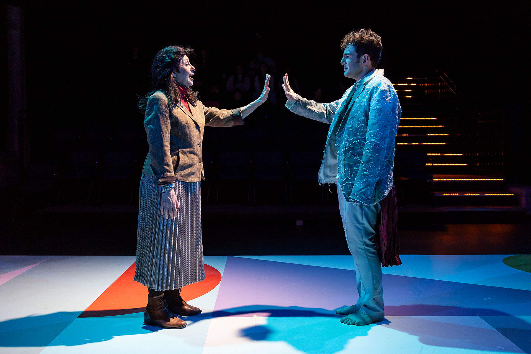 Bright colored geometric shapes — yellow circles, purple triangles and red half-moons — that used to decorate many a shirt in the 1980s cover the floor of Pepperberg’s lab. Imagined by scenic designer Qingan Zhang, the space is stacked with cardboard boxes, gray metal file cabinets and colorful sticky notes dotting a corkboard, and it’s where much of the action occurs. The combined efforts of the creative team — sound, lighting, movement, costume, props, intimacy and stage management — make this production a delight to watch.