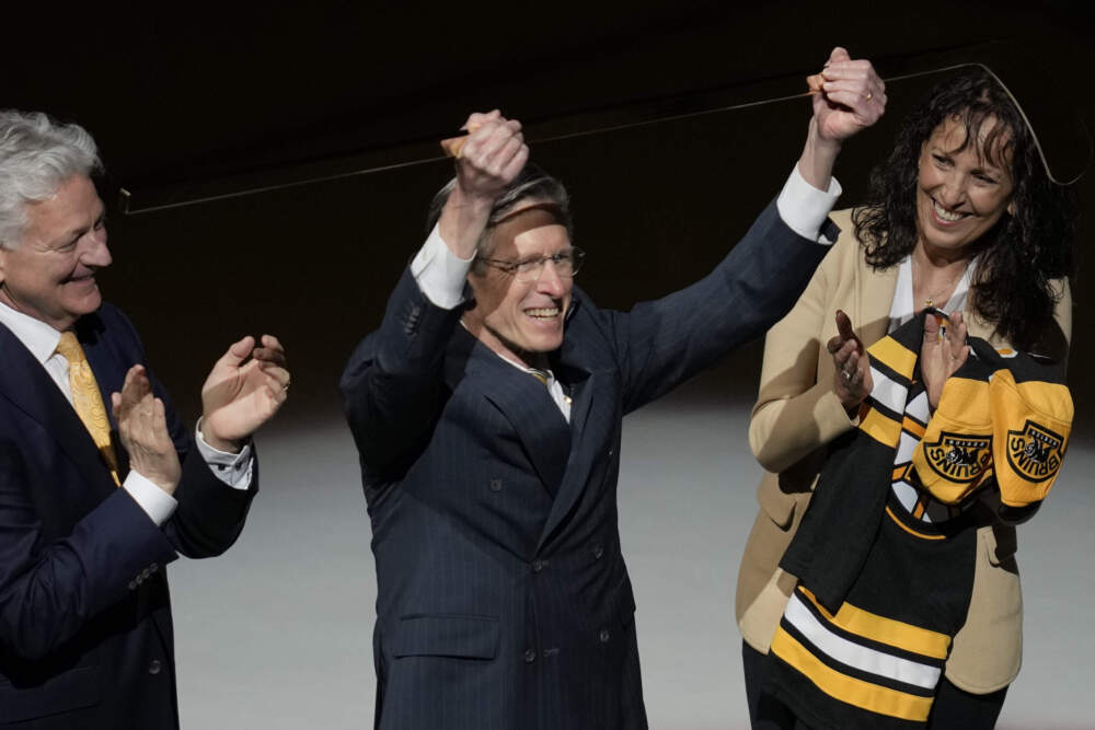 Edwards was recognized before the Bruins’ regular-season finale against the Ottawa Senators and presented with a golden stick in honor of his nearly two decades with the team. Edwards put his hand over his heart in thanks and lifted the stick up as fans cheered during the pregame ceremony.