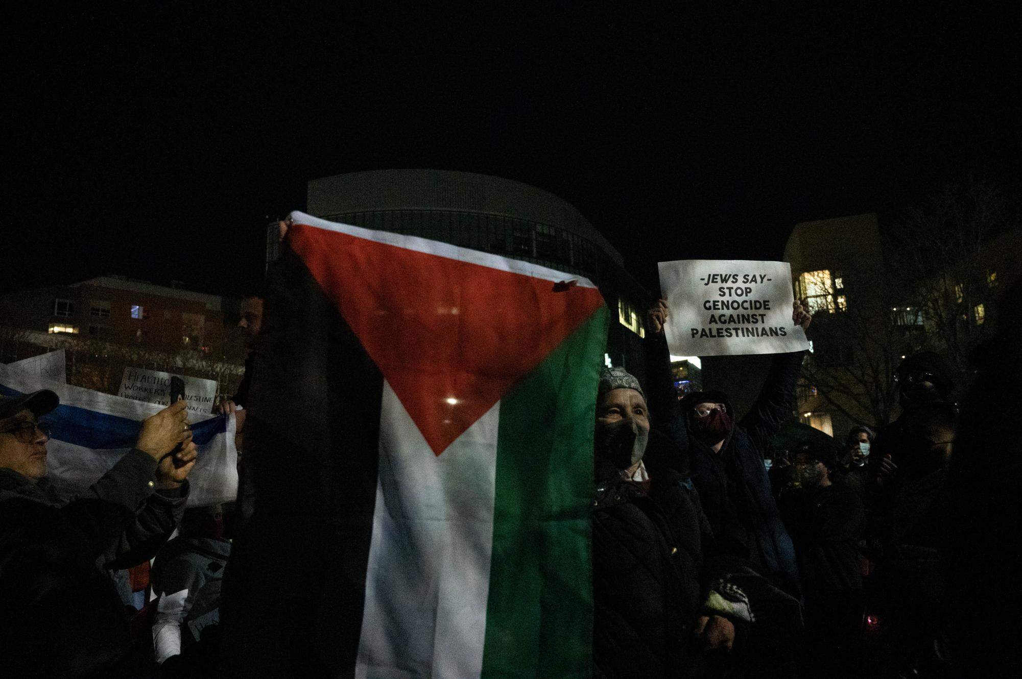 Videos shared with WBUR appear to show a counter protester holding an Israeli flag who attempts at one point to provoke the crowd to chant “kill the Jews.” The videos show some in the crowd responding with boos. Northeastern would not say whether the incident caught on video contributed to the decision to call police and clear the camp.