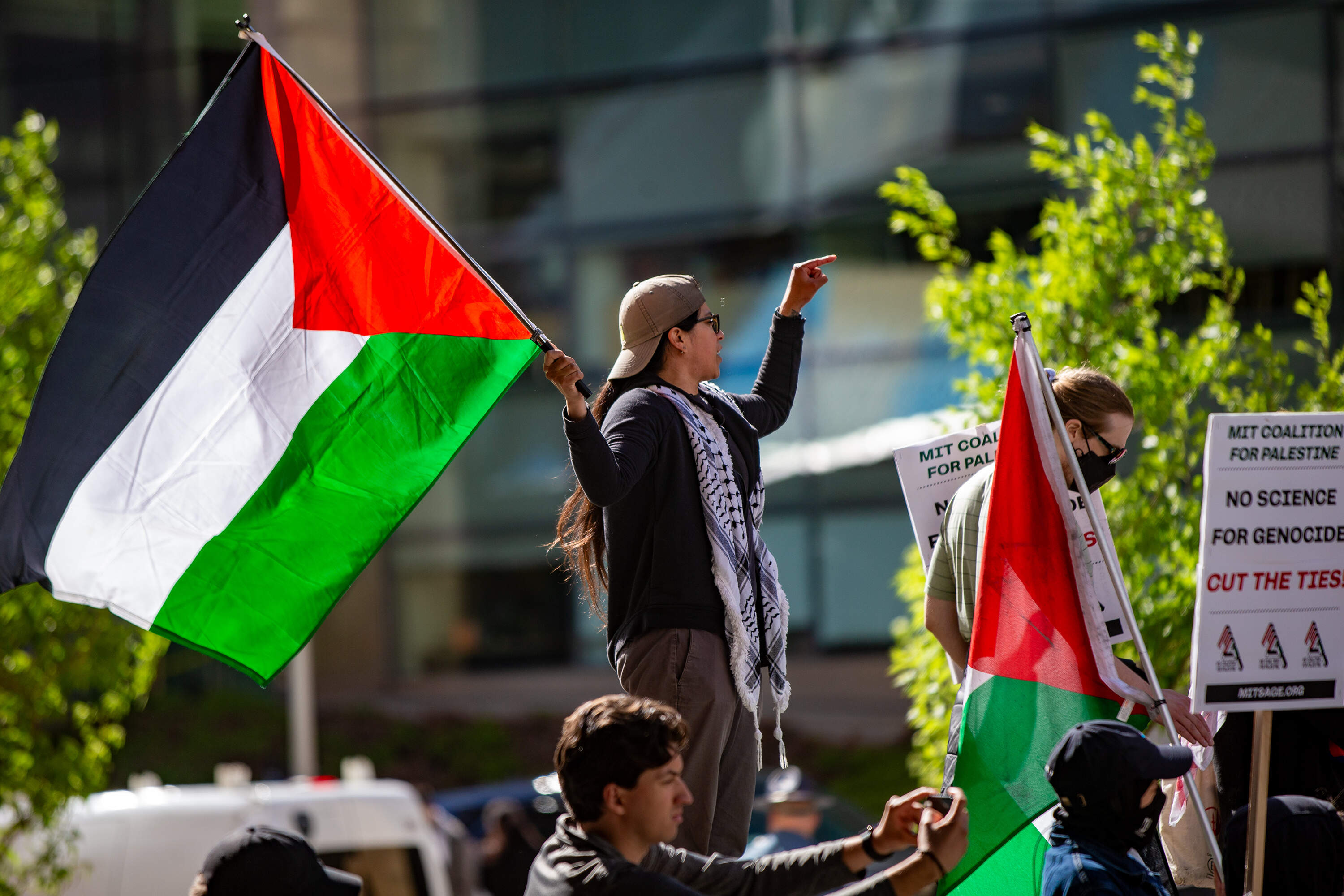 Protesters had started the day quietly, near their encampment on the Kresge Lawn. A midday rally raised the volume, and students marched, chanting and carrying signs and large Palestinian flags, to MIT's Stata Center.