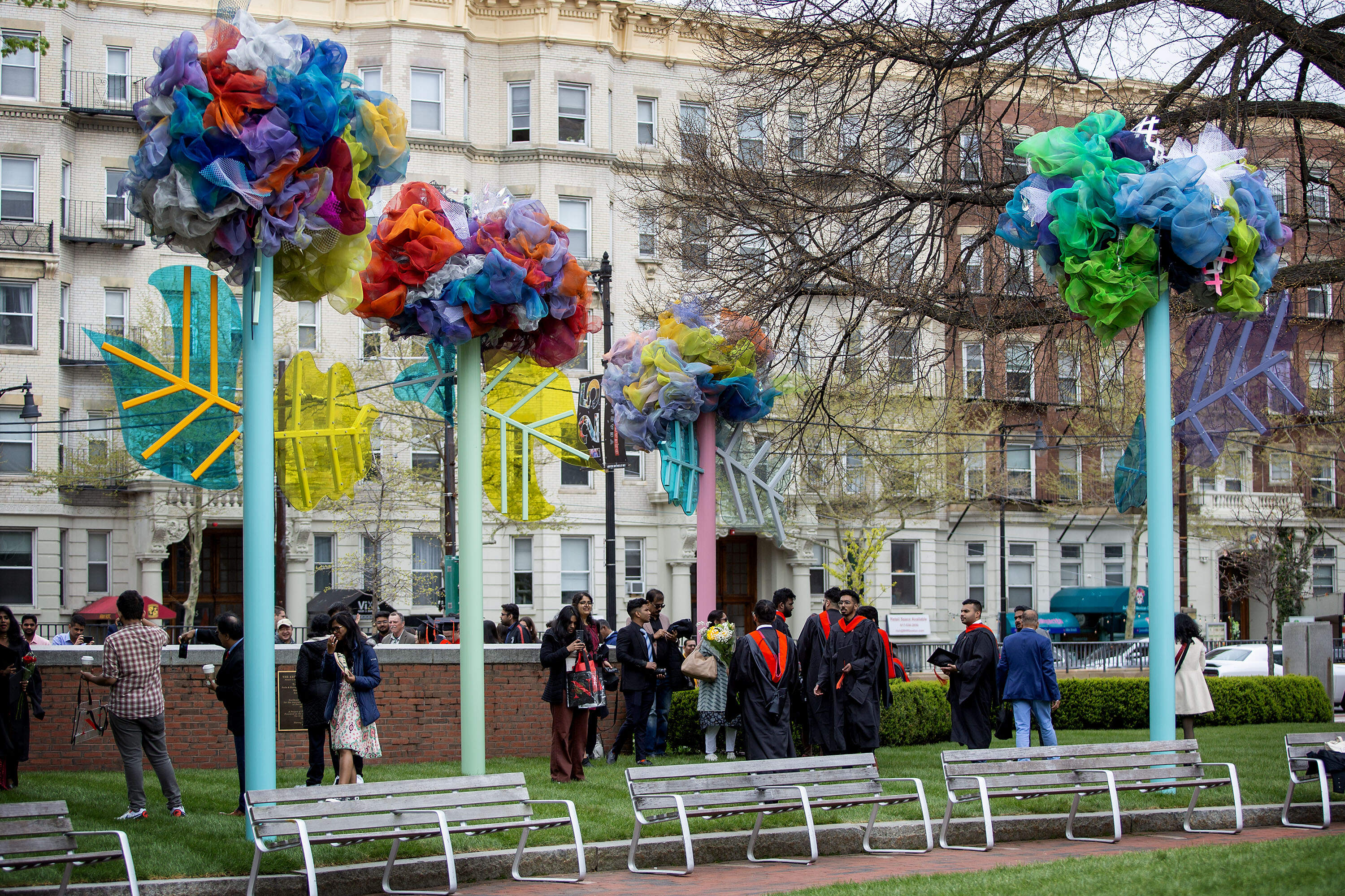 It was graduation day, and students in caps and gowns posed by the Northeastern University sign on Krentzman Quad. Behind them towered five giant flowers. Each stalk was fifteen feet high, topped by puffy, iridescent blooms that stood out against the gray stone buildings ringing the quad.