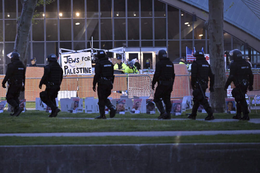 Police in riot gear arrived around 4 a.m., encircled the camp and gave protesters about 15 minutes to leave. A crowd outside the camp began gathering and chanting pro-Palestinian slogans, but were dispersed by 6 a.m.