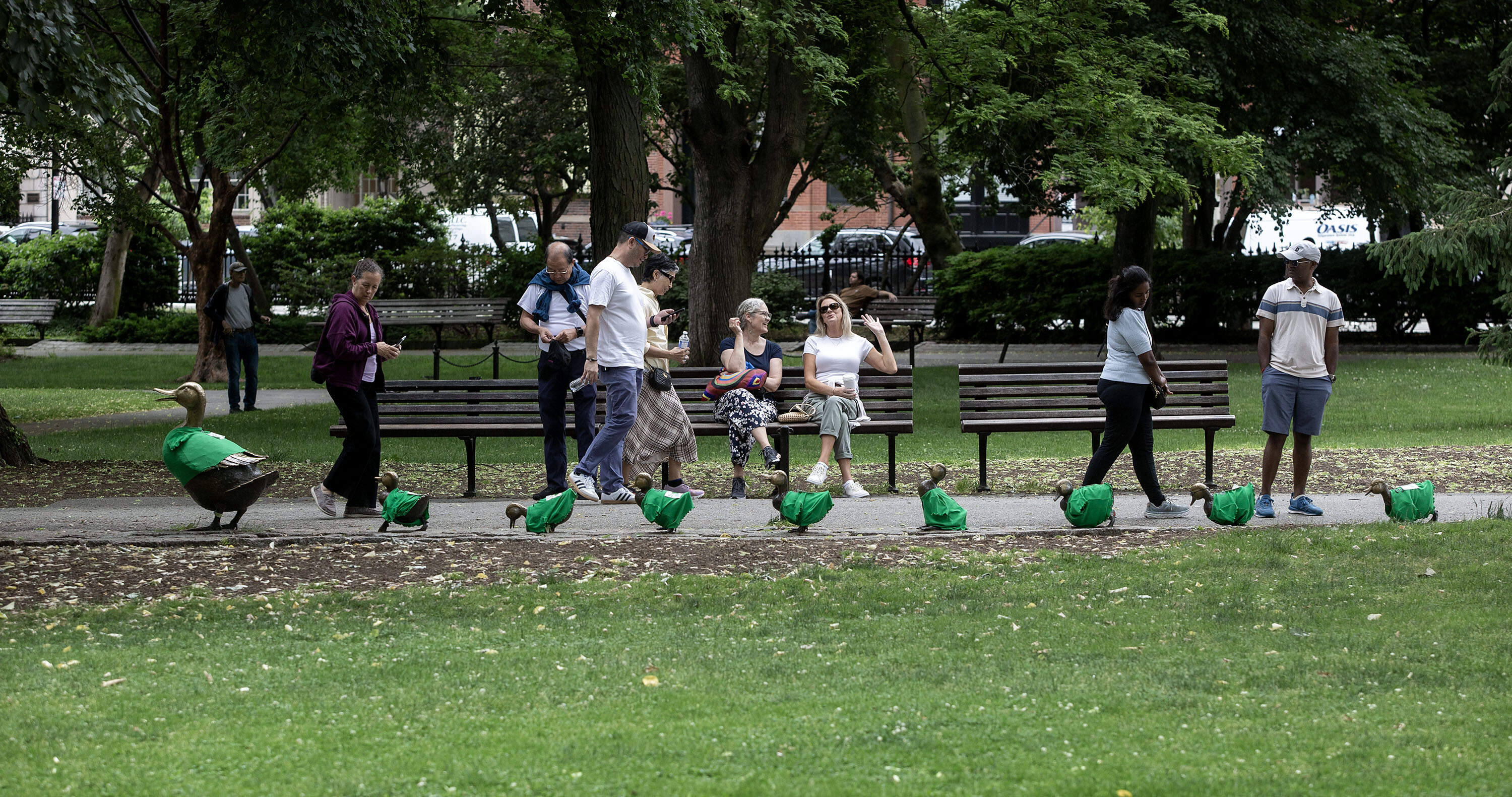 Boston Public Garden's bronze waddlers, the "Make Way for Ducklings" statuettes, seemingly wriggled into little Celtics-inspired outfits Thursday, just hours ahead of the Game 1 matchup between the C's and Dallas Mavericks in the NBA Finals.