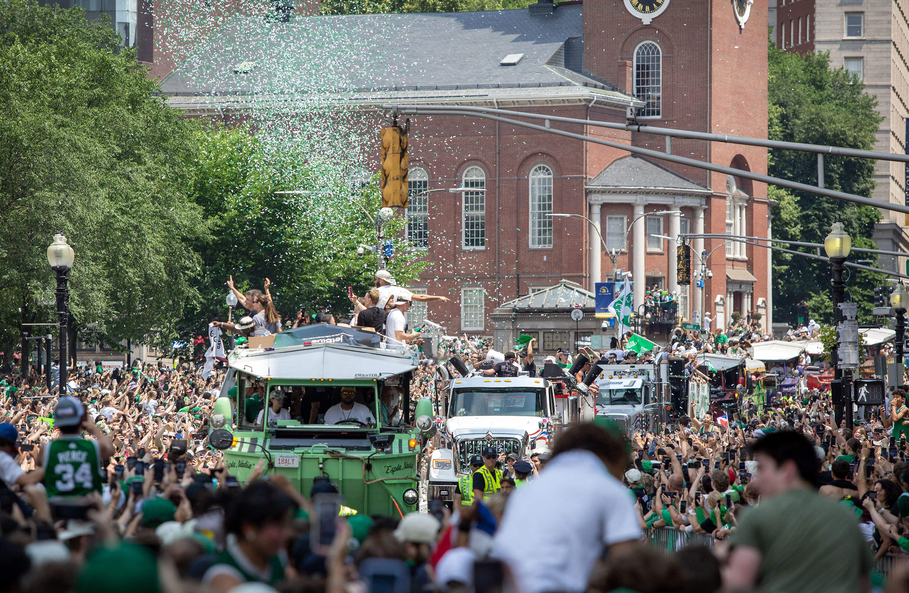 As is custom in this town steeped in history, the C's rolled down the route in Duck Boats, amphibious vehicles built for World War II that have found a second life ferrying tourists and pinnacle athletes. The height of the ducks makes for easier viewing for fans lining the route. Players in the past have had some fun interacting with the fans, even enjoying the occasional beer tossed their way.