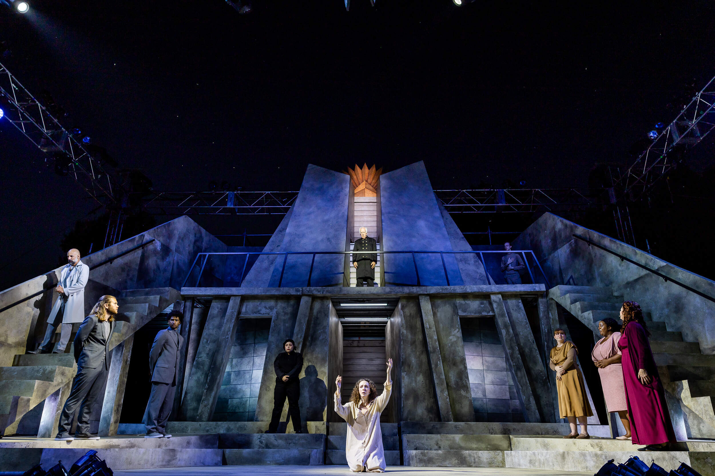 He added, “Because we’re outdoors, there’s something unpredictable about what might happen night to night. There’s noises of the city, people walking by. There’s the weather. We’re all in this experience together. If the clock starts to chime, that’s part of the show. If there’s a police car, that’s part of the show. It puts us in the same place, where there’s less separation.”