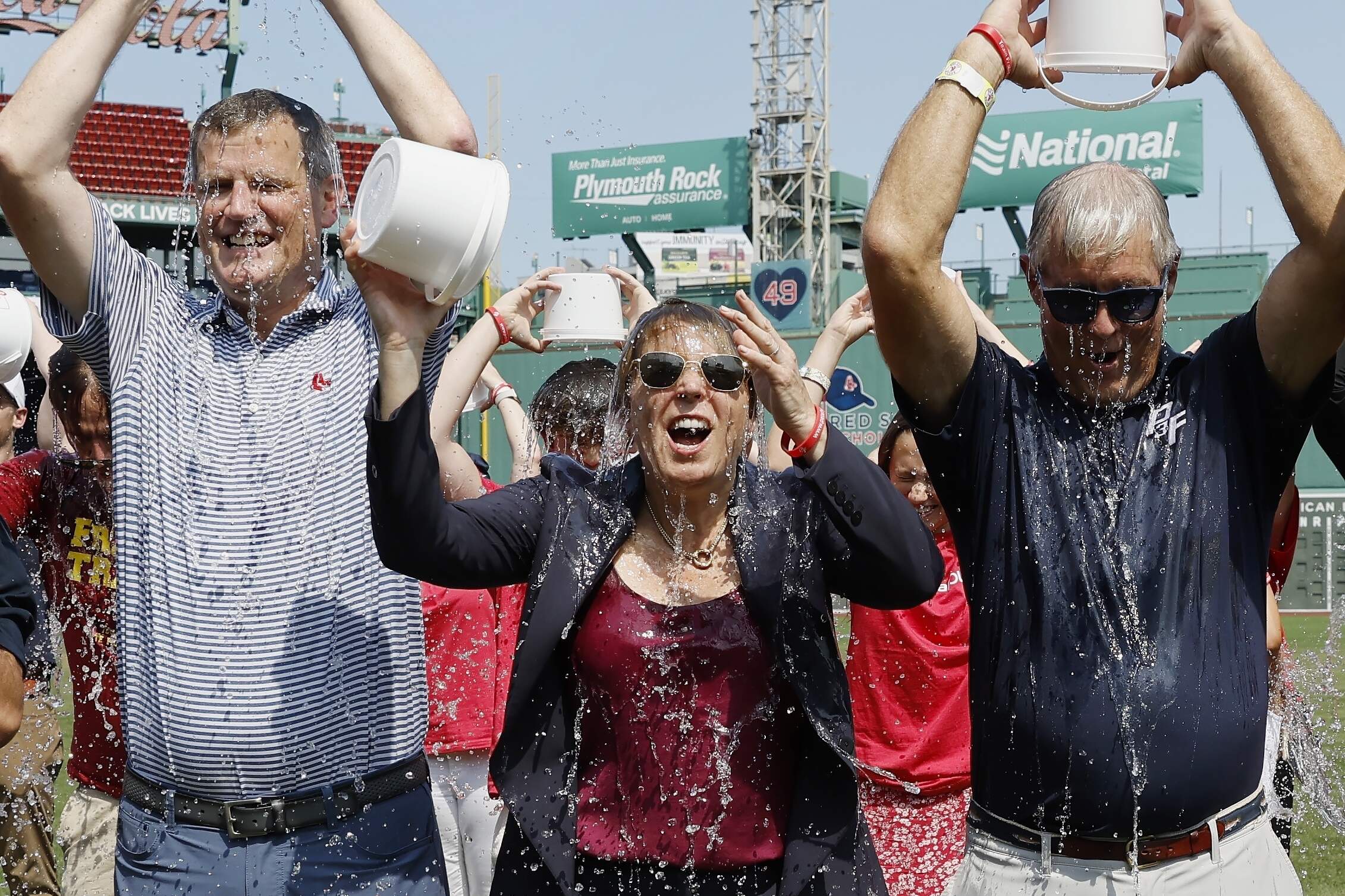 Dozens of people, including the Massachusetts governor and several sports stars, dumped cold water on themselves at Fenway Park Thursday to mark the 10th anniversary of the ALS ice bucket challenge.