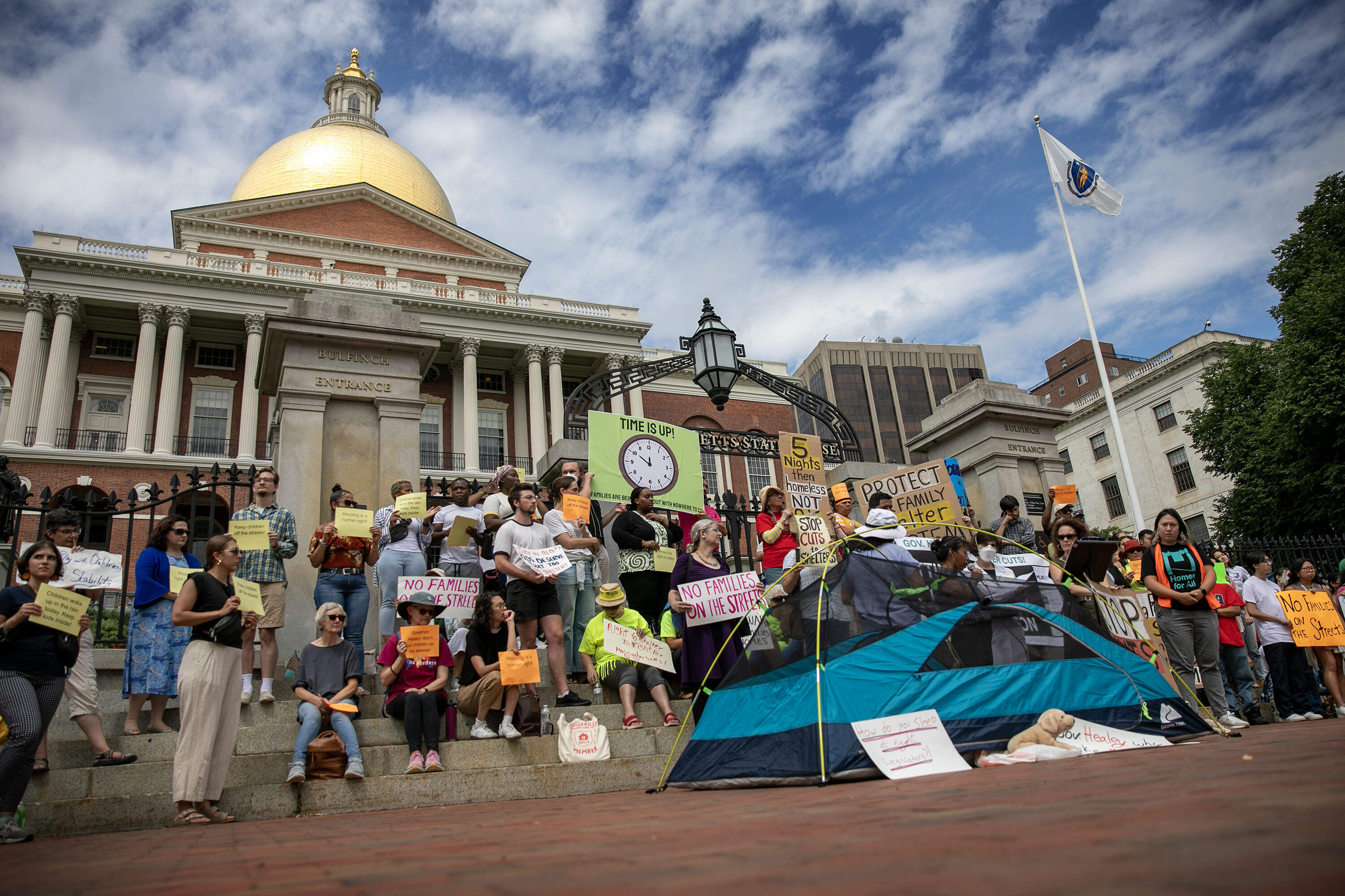 Advocates are protesting the new shelter limits, saying it's impossible, and even cruel, to expect a family new to the country to have housing set up within five days. The Healey administration has defended its actions, saying the shelters are full and the state cannot afford to take on more migrant families.