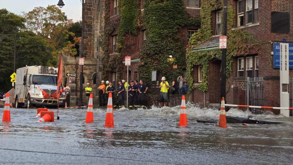 By the time water commission workers arrived on scene shortly after 6:30 p.m. to stanch the flow of water, the flooding had left a 9-foot-by-9-foot flooded hole in the middle of the square.