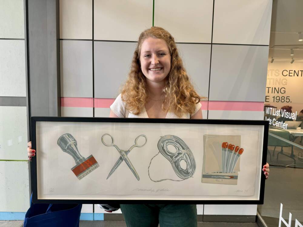 “I’m studying political science, so I was drawn to the piece about censorship that had a political message,” she said. “And then also, the room that I want to put it in has this exact same orange, so it just seemed perfect.”