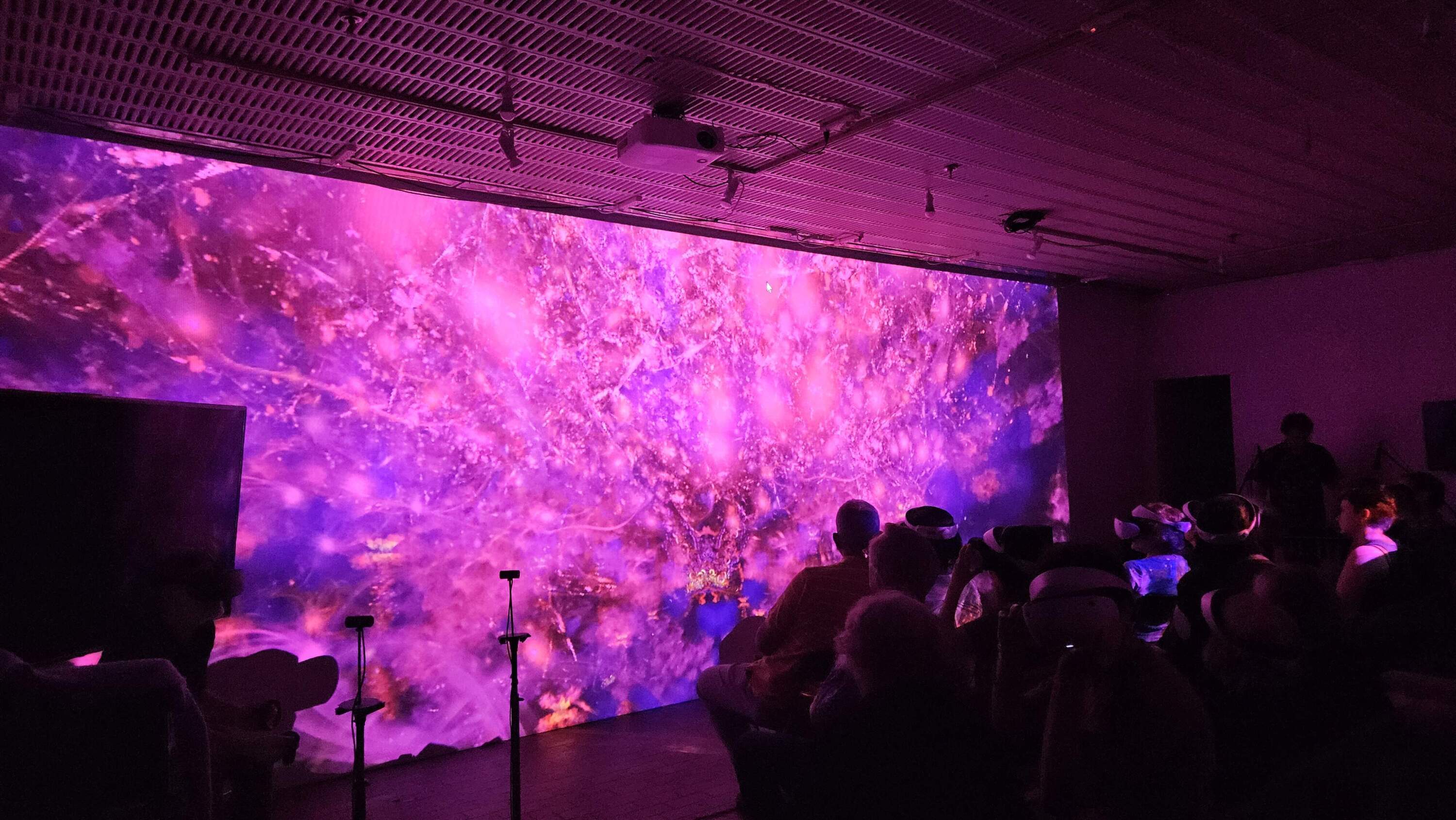 Bill Sebastian sat at the front of the gallery next to a large projection on the wall, looking futuristic in a black headset and holding a controller in each hand. The lights dimmed, and in the far corner vibraphonist Julian Loida began a questioning refrain. Sebastian lifted his arms as if he was steering an invisible ship, and the glowing images projected on the wall began to move. Abstract and phosphorescent, the transmuting figures sometimes evoked familiar shapes: squid tentacles, a dragon rearing its head, an orb of yellow flower petals like a cocoon. The same landscape was visible inside our visors, rendered in three dimensions, the images seeming to pass over and around us before receding into dark, infinite space.
