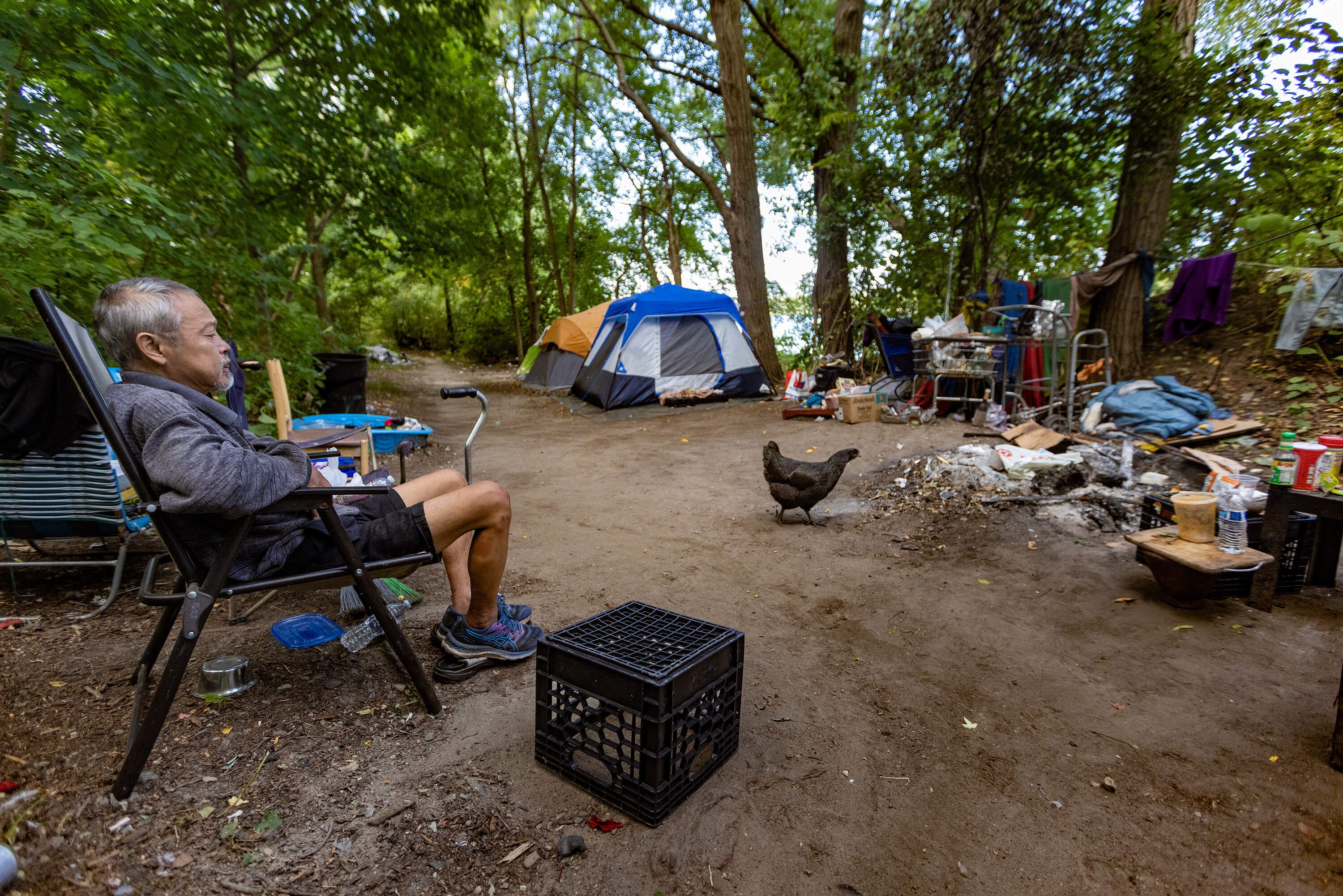 Michael Mello, 59, was hanging out here, too. He lives farther down the riverbank in a tarped shack he said he built five years ago when a heart problem ended his career in underwater construction demolition. He said he was forced to give up his condo.