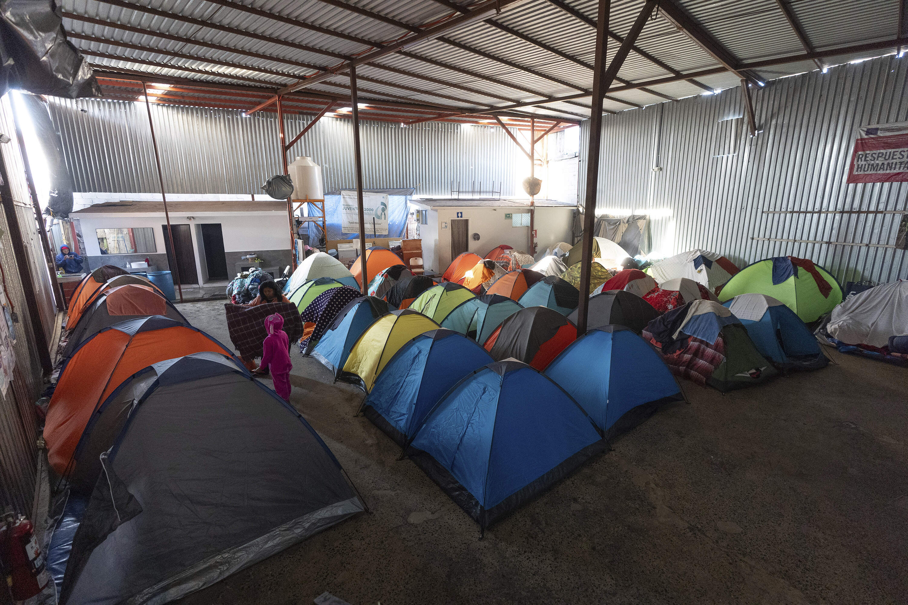 The risks and distances already endured by migrants to make it to Tijuana are obvious in the stacks of belongings on top of the rows and rows of bunk beds.