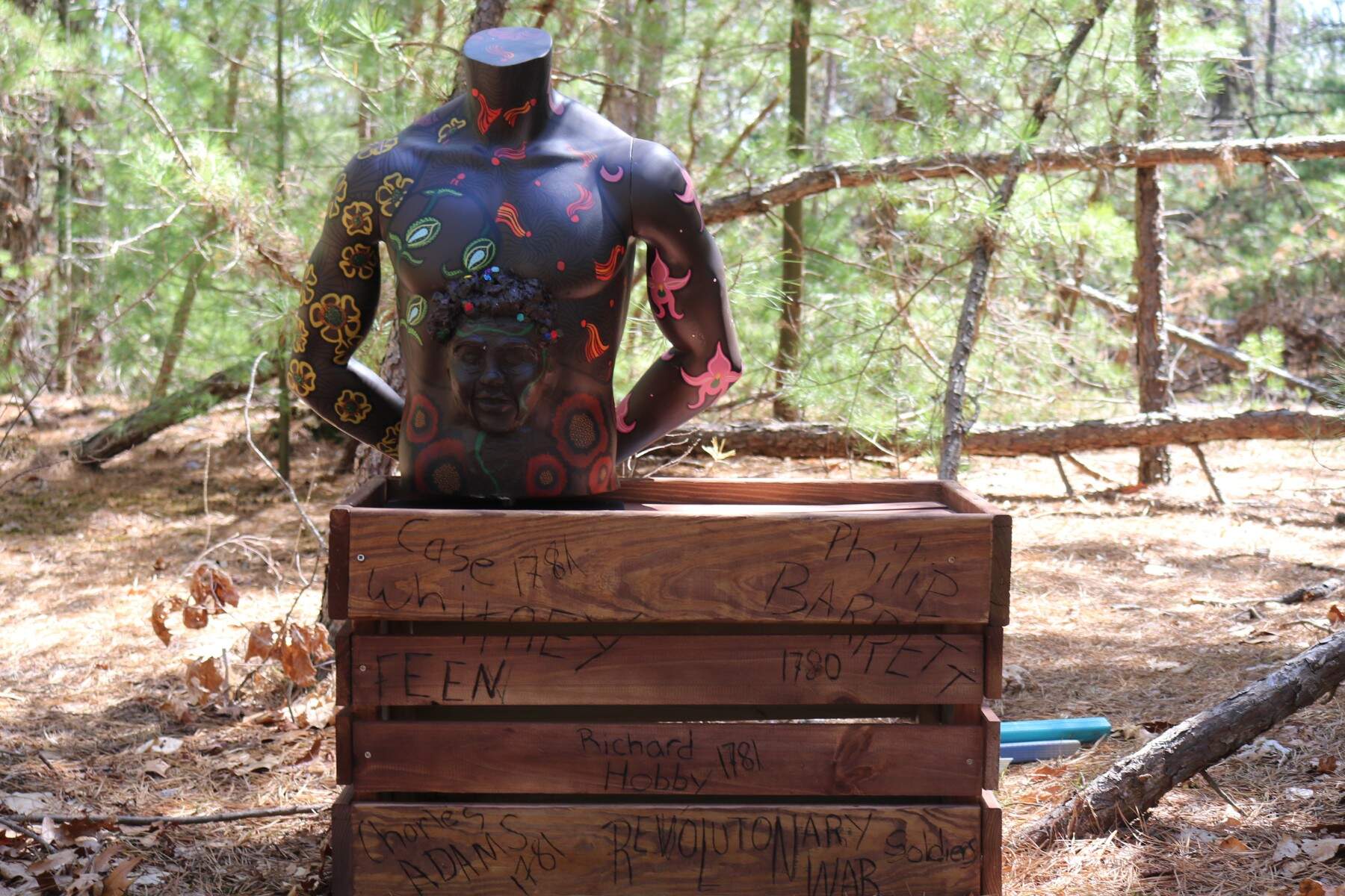 “That mannequin stands on a wooden base that has all the names of Black soldiers from Concord that I could find,” McLeod said. Her “Physiology” sculpture contains fruit that grew in the area, and the “Community Actualization” sculpture has a reference to “Malcolm X who converted to Islam while imprisoned in Concord,” a fact, she said that was also referenced in the book.