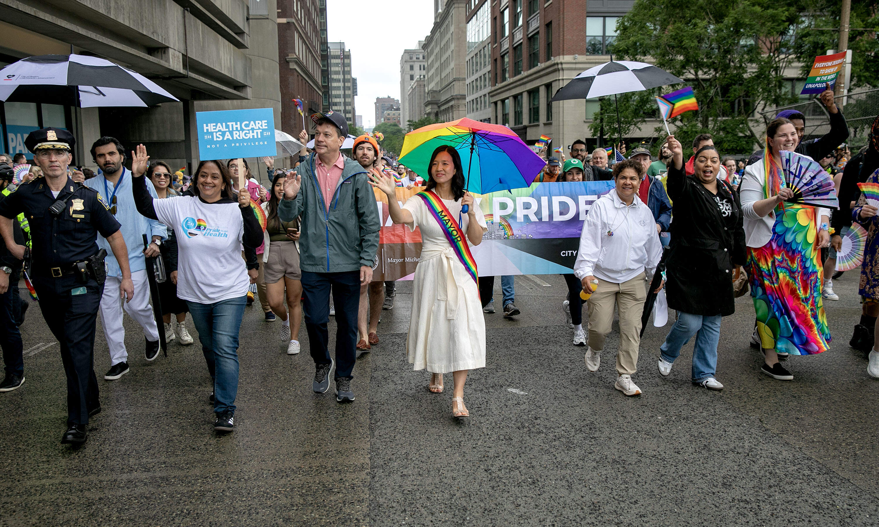 The parade began at 11 a.m. in Copley Square, converging the two causes as marchers crossed downtown. Twirling rainbow umbrellas and waving Pride flags under drizzling skies, paraders whooped and cheered as they set off through Boston's Back Bay.