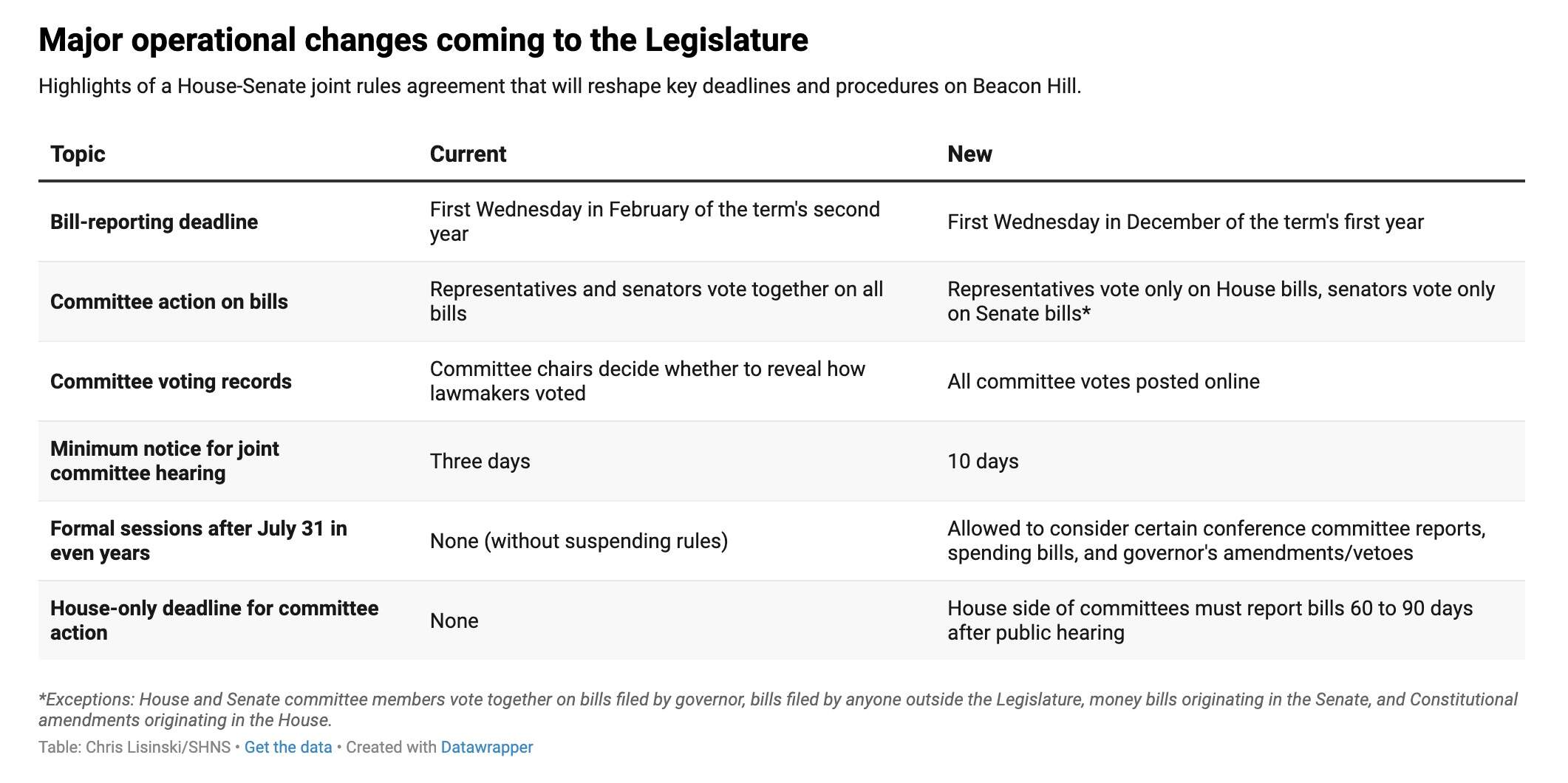 "Among the reforms are longer public notice periods for hearings, mandatory committee hearing livestreaming and archiving, an earlier reporting deadline for joint committees, the recording and posting of committee votes, new requirements for bill summaries, and rules ensuring more timely public access to conference committee reports," a fact sheet provided by Creem's office said.