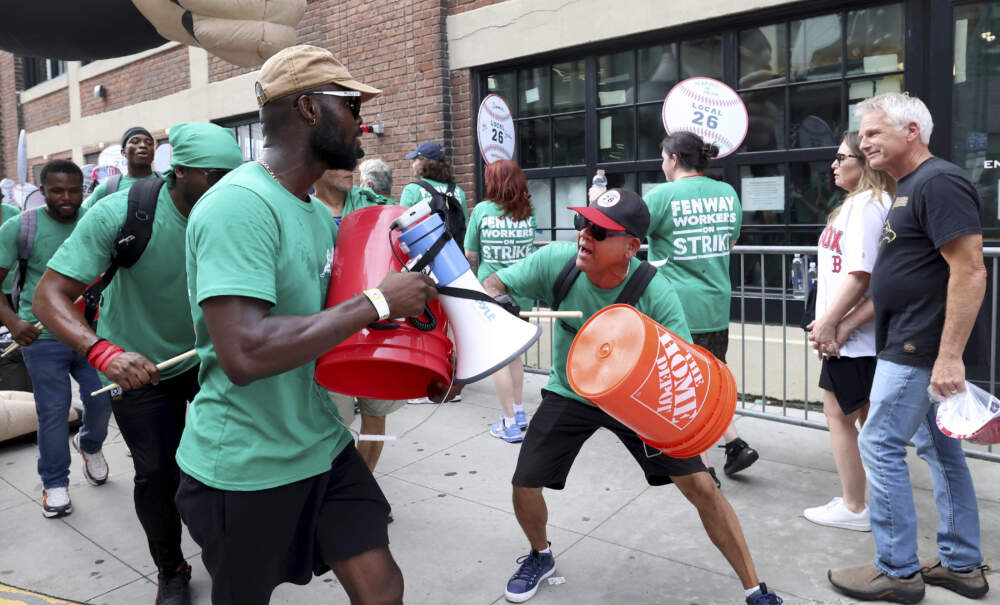 Striking Fenway Park vendors banged on drums and shouted “Don't buy food!” while walking a picket line outside the home of the Boston Red Sox before Friday night's game against the Los Angeles Dodgers.
