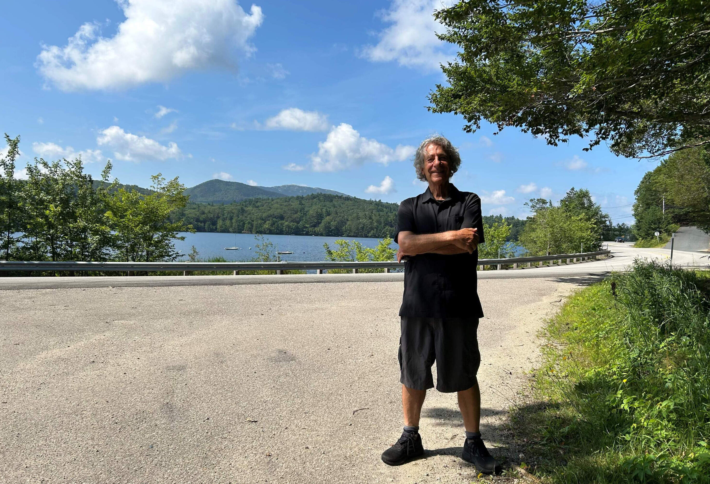 He followed a path from the center of the village, up a hill, through the woods and into a cemetery, which opened up to an expansive view across the blue waters of Dublin Lake to Mount Monadnock, rising into a blue sky with tufts of white clouds.