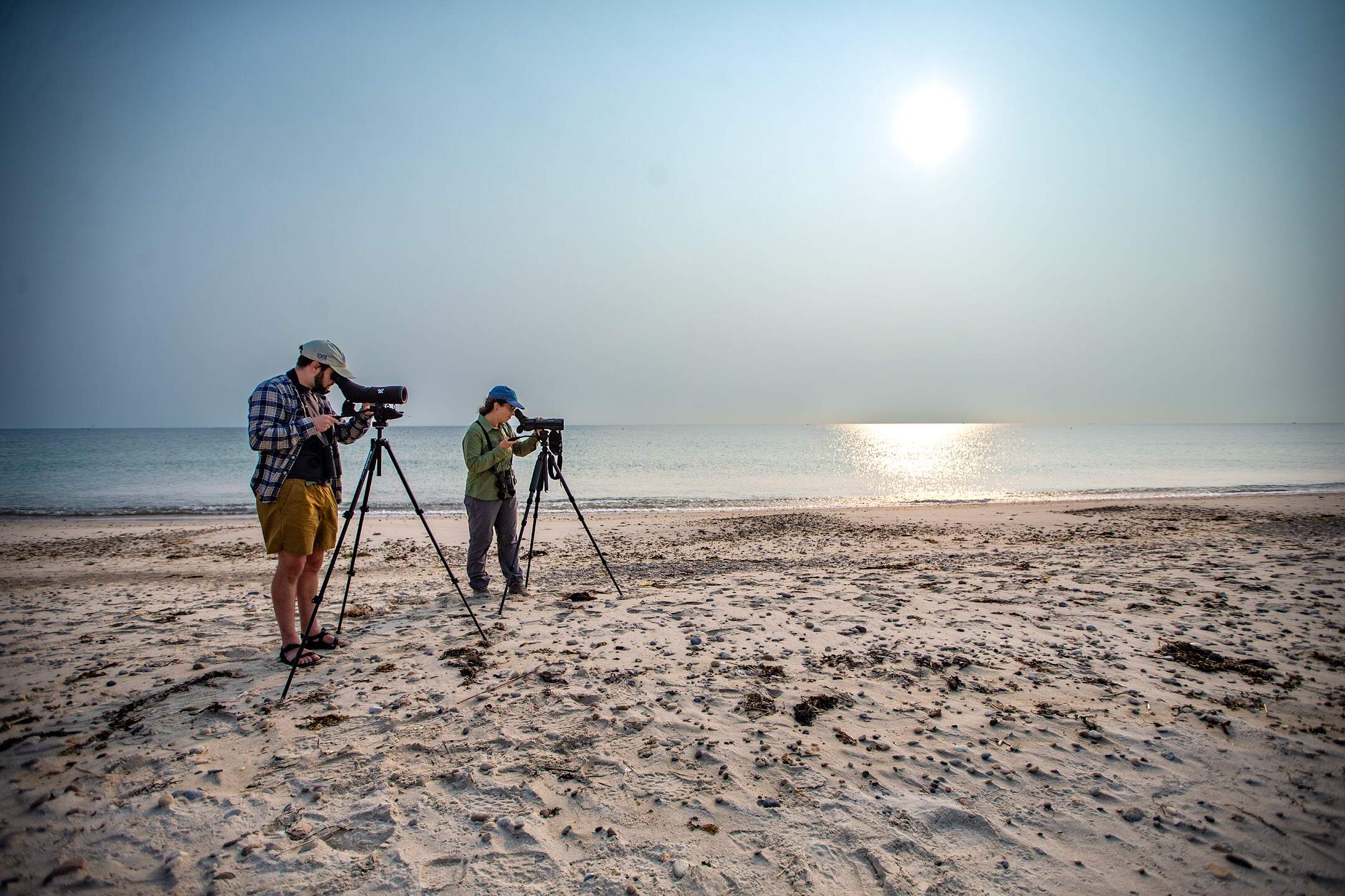 Oceanside, Negreann and DiNunzio spotted a large flock of several hundred roosting shorebirds. Peering into their spotting scopes, they counted 136 semipalmated plovers, 176 sandpipers and about 10 sanderlings.