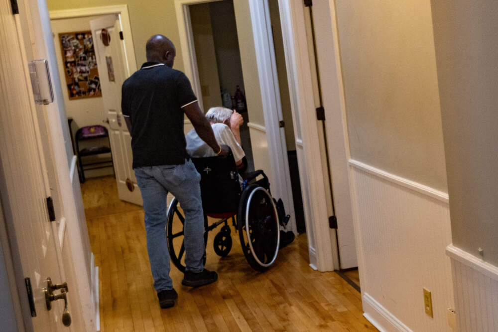 The workers wheeled the residents around or assisted them walking, gave them showers, helped them get dressed and fed them if they were unable to feed themselves. They joked and laughed with them, and gave them high-fives. The workers cooked a meal of chicken and rice with a tomato-based sauce.