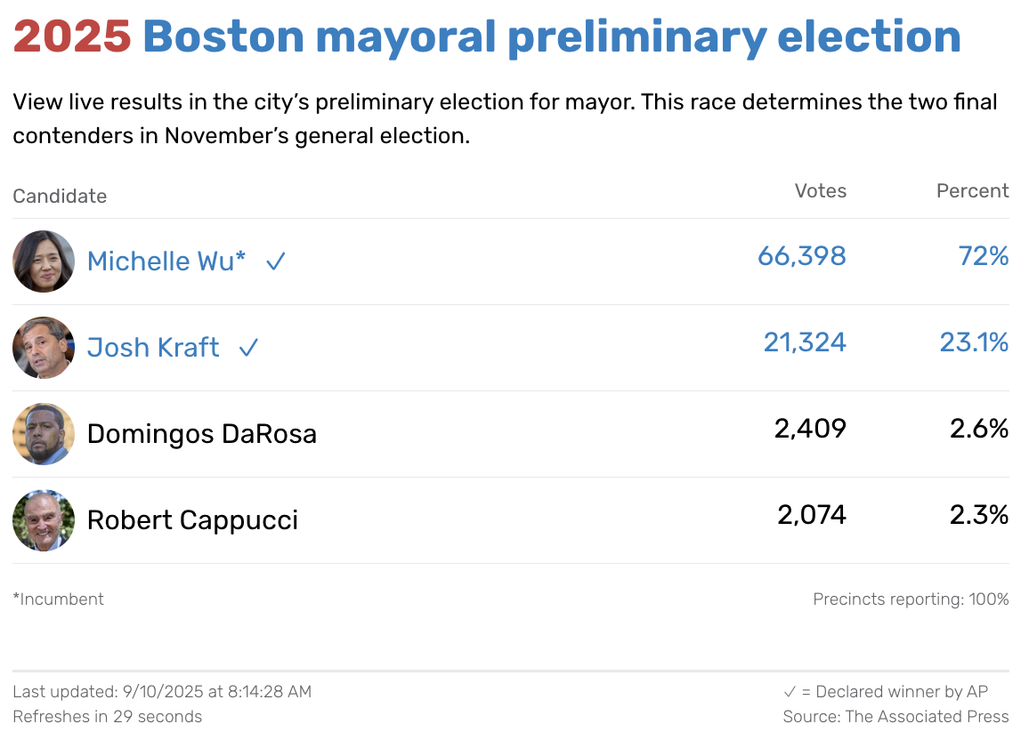 Here are the results of 2025's Boston mayoral preliminary election as reported by The Associated Press.
