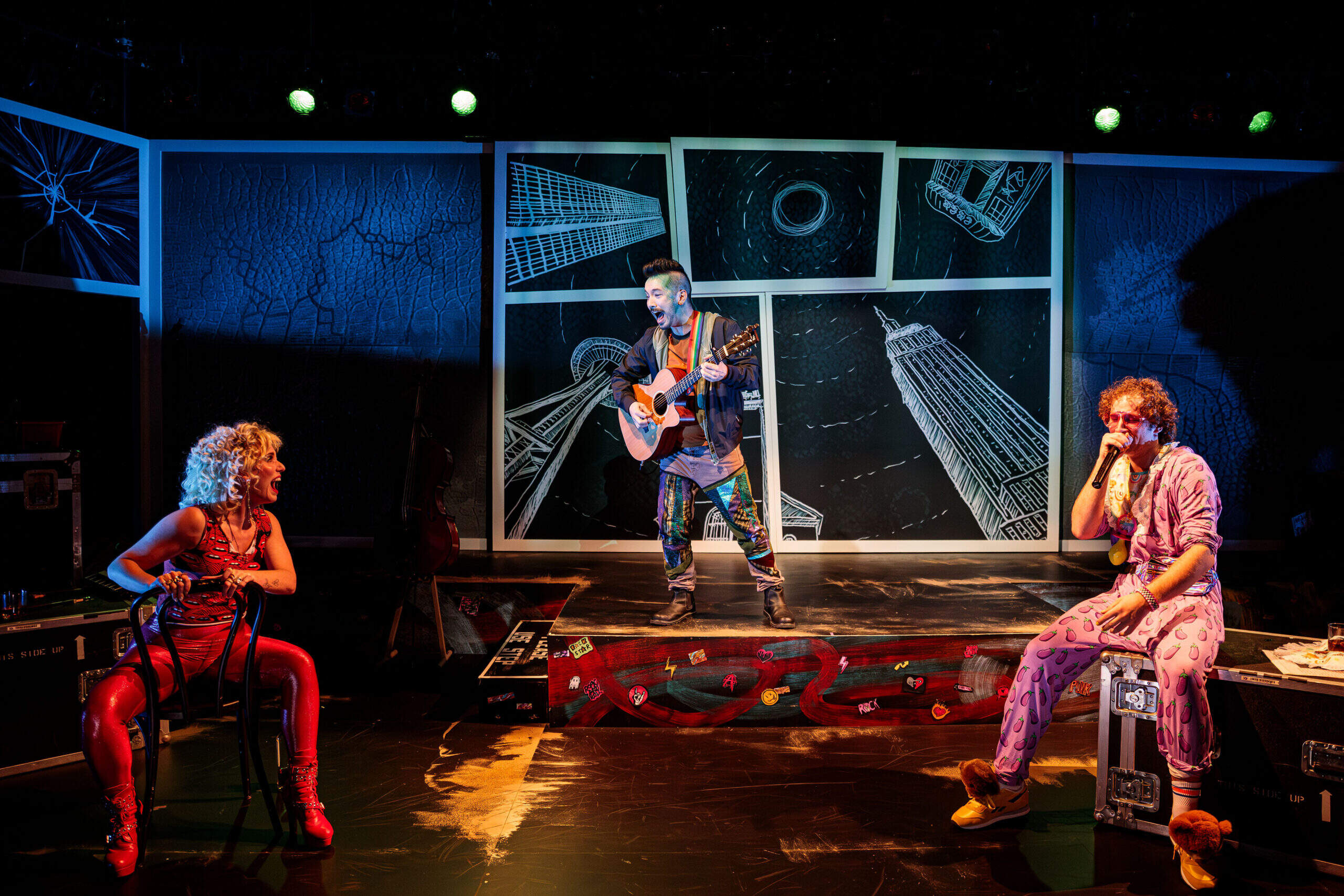 Trevor’s appearance keeps him from finding friends and lovers, but the Grindr app leads him to Cary (the fantastically funny, talented actor and multi-instrumentalist Peter DiMaggio). Cary is well-meaning, affable and a little awkward. While their relationship blooms, they run into a singing Siren with a macabre disposition (a skillful Chelsea Nectow who plays the keys, a kazoo, maracas and more). Siren, a “scary blonde” whom Trevor has dreamed about, warns him of a pending dragon apocalypse and needs his help to stop it. If he refuses, the consequences will be dire.