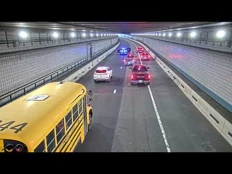 Surveillance video from the Massachusetts Department of Transportation shows the black-and-white pup heading toward oncoming vehicles in the Ted Williams Tunnel on Thursday morning. With cars and trucks whizzing by, it moves from the middle of the lane to a side wall.