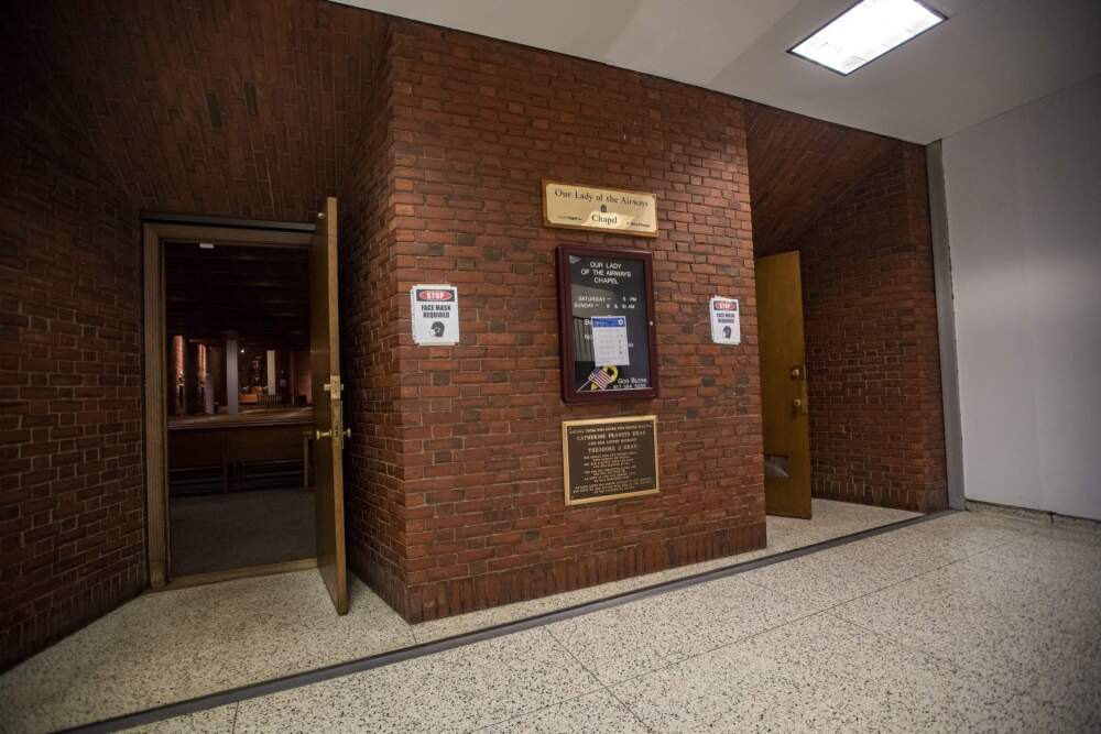 Built in the 1950s so that airport employees could attend Mass right in their sprawling workplace, it’s widely considered the first airport chapel in the United States. It’s also among the last to still function as a Catholic church instead of an interfaith space — though Muslim prayer rugs discreetly placed on the rear pews show it welcomes a variety of believers.