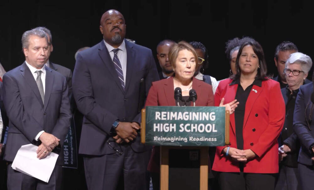 "I said a year ago that we were going to work together to create a new model for students in Massachusetts, a new vision that sets every high school student up for success, and today we're speaking to that. Because here in our state, we don't turn away from students, and we don't back down from high expectations," Healey said at a press conference at Dedham High School on Monday.