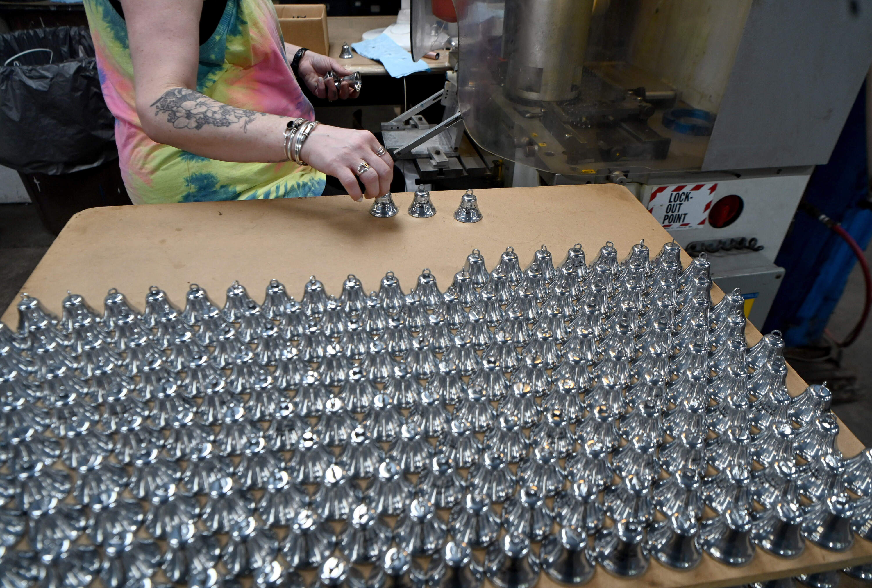 On the factory floor, hydraulic presses form metal sheets into bells. The company’s 25 employees do everything from operating the presses to stringing ribbons by hand.