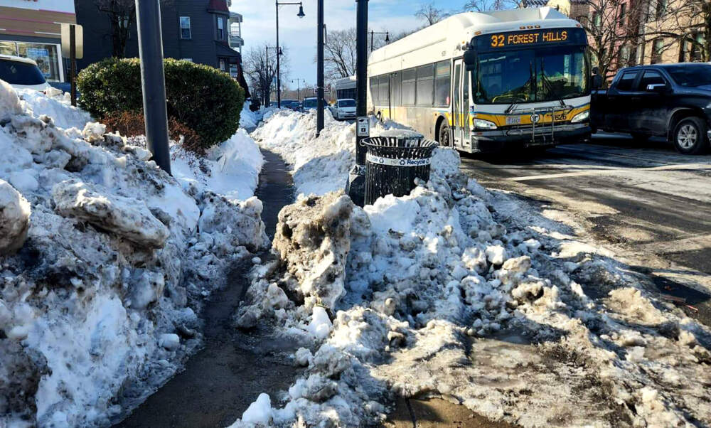 Torres Radisic pointed out an MBTA bus stop, which serves the 32 bus route. It was flanked by snowbanks, but had a 3-foot-wide cut-out for boarding the bus. A bumpy sheet of ice encased the sidewalk up to the curb.