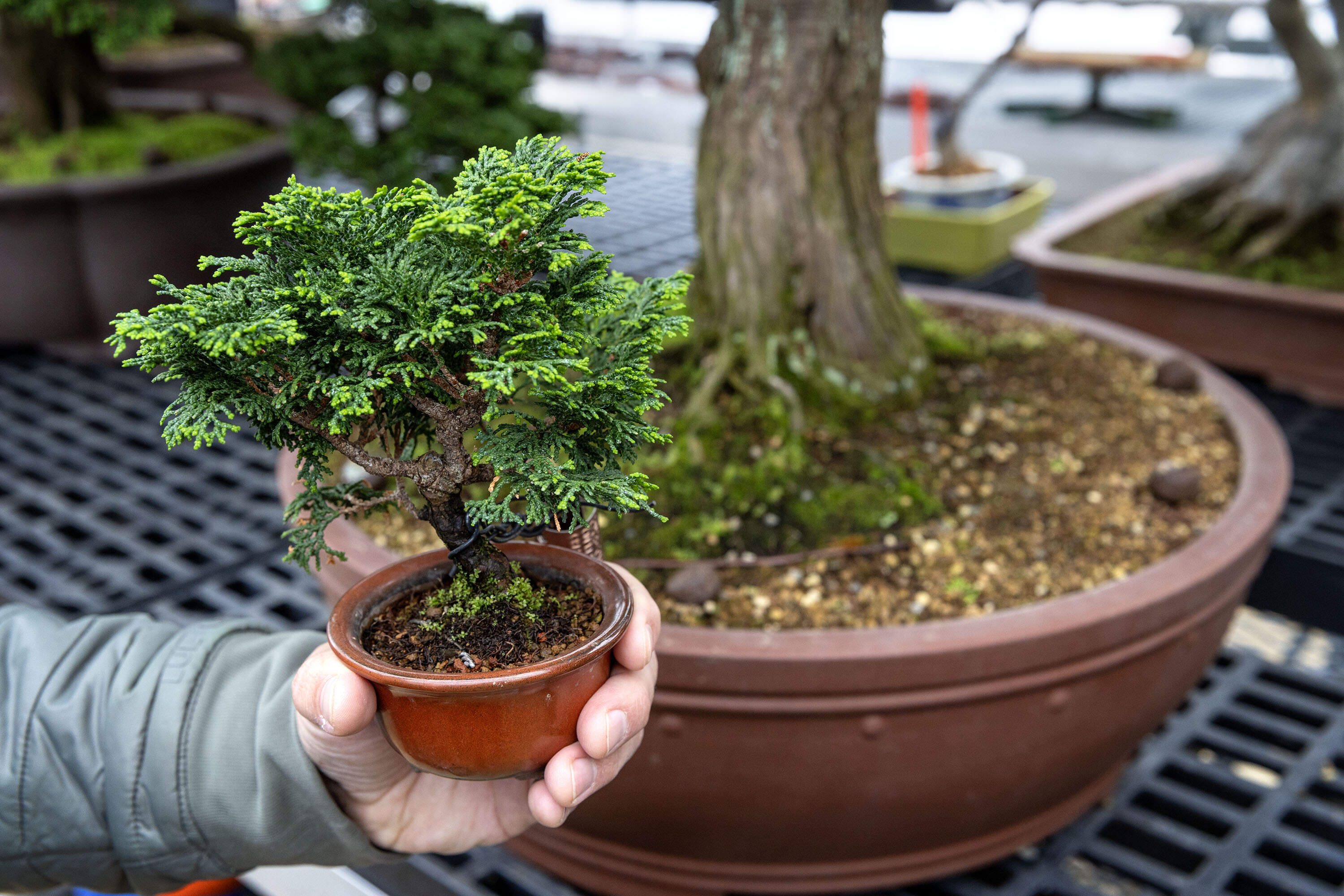 It’s also during this time that the trees’ branches are pruned and bound with sculpting wires by bonsai specialist Jun Imabayashi, creating their unique shape. Bonsai are lightly trimmed in the summer, too, but “winter is a great time for structure pruning,” Copeland said. “Larger cuts are a little easier to make in dormancy when the trees are essentially sleeping.”