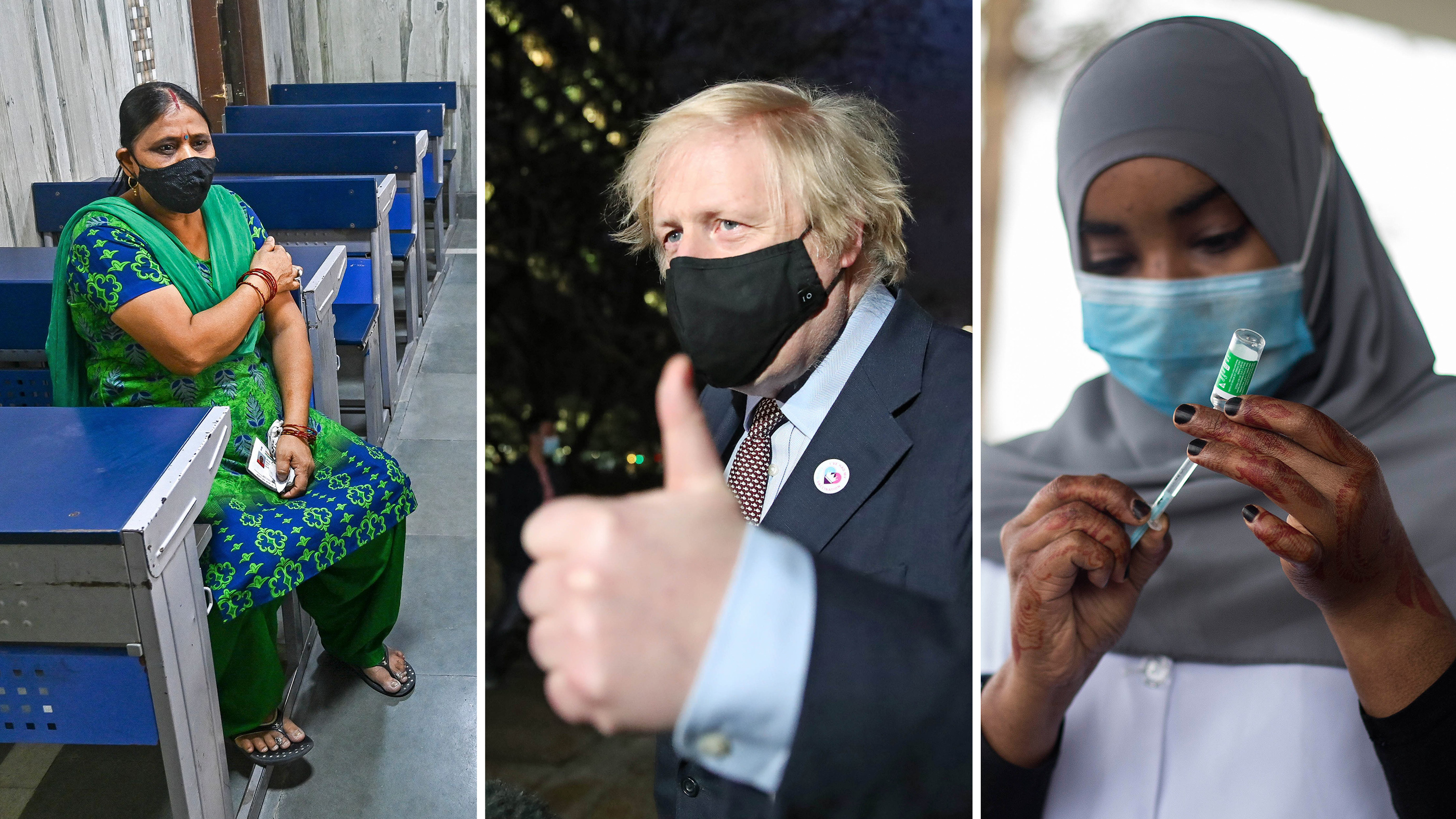 From left: A New Delhi woman waits in an observation room after getting the Covishield vaccine (the name used for the AstraZeneca vaccine in India) on May 26. U.K. Prime Minister Boris Johnson leaves a vaccination center after his first AstraZeneca dose on March 19. On March 9, Nairobi, Kenya, began vaccinating groups, including health care workers and older people, with the AstraZeneca vaccine. (From left: Prakash Singh, Aaron Chown, Robert Bonet/Getty Images)