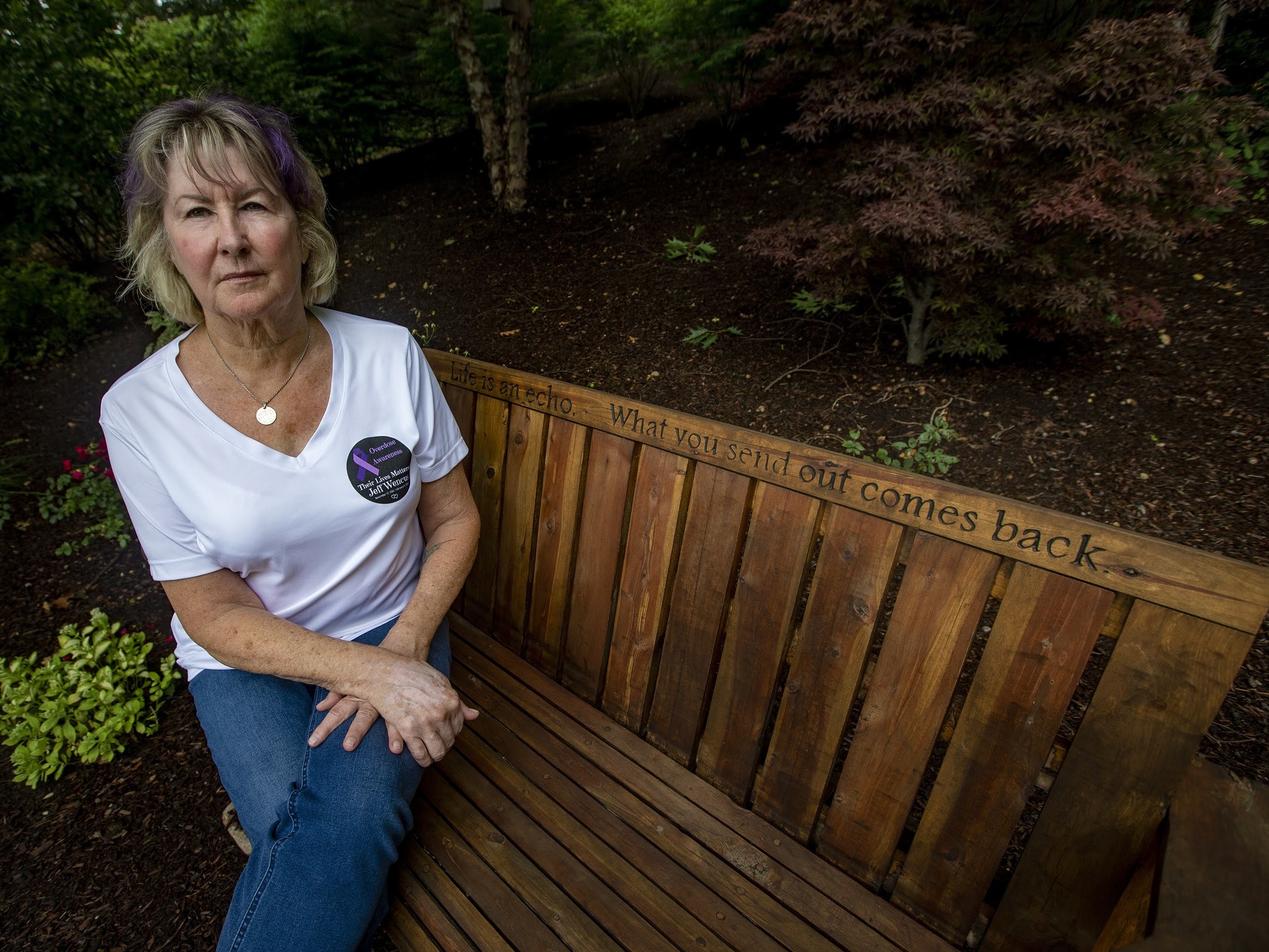 Support WBURThe Purdue Pharma Deal Would Deliver Billions, But Individual Payouts Will Be SmallPlay04:59Download AudioSeptember 28, 2021Martha BebingerfacebookEmailLynn Wencus sits on a bench in her backyard dedicated to her son Jeff, whom she lost to an opioid overdose in 2017. She is one of many people filing an individual claim in the Purdue Pharma settlement. (WBUR)