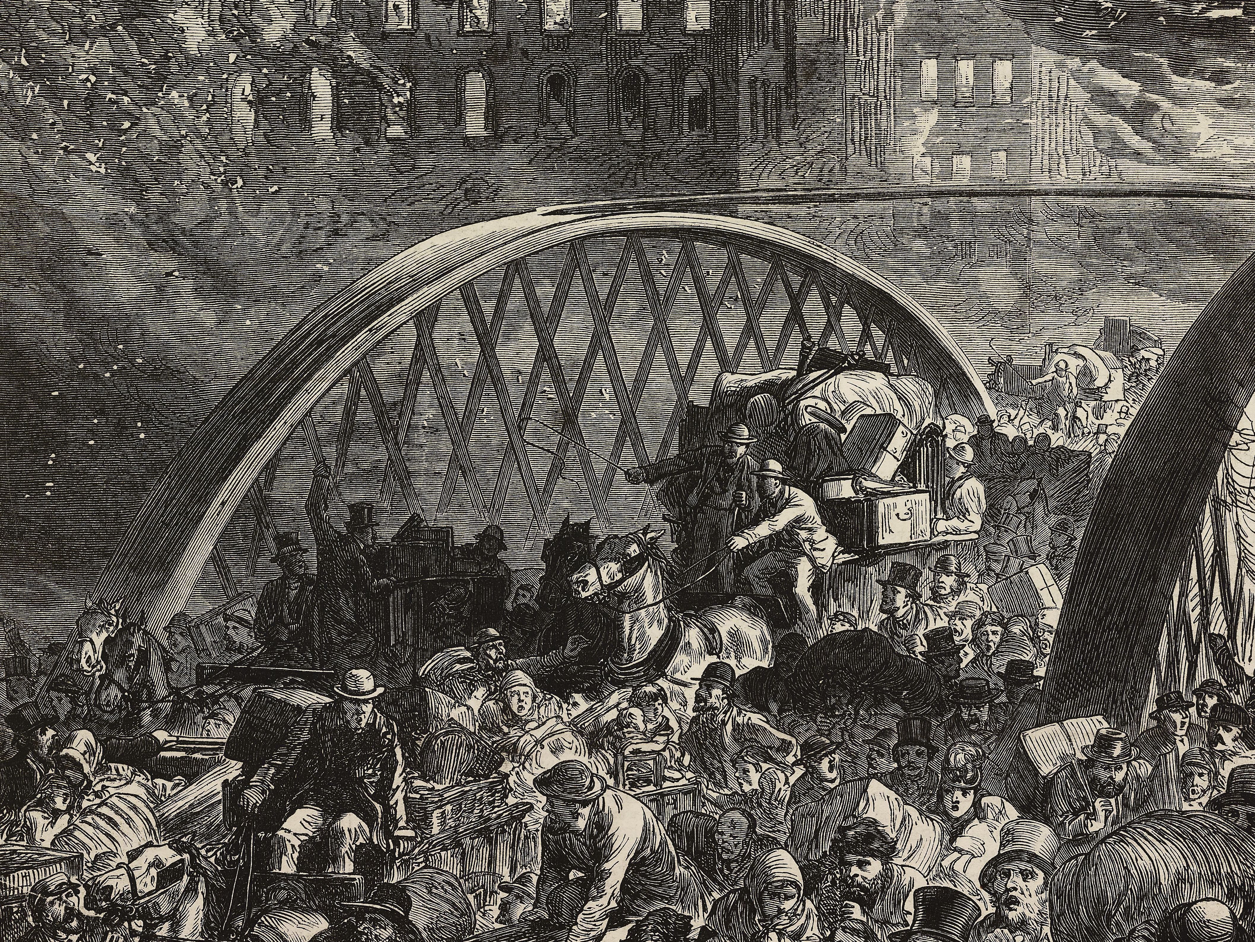 Support WBUROpinionOpinion: 150 years after the Great Chicago Fire, we're more vulnerablePlay02:37Download AudioScott SimonOctober 02, 2021 ShareAn engraving from the Illustrated London News in 1871 of the Randolph Street Bridge during the Great Chicago Fire. (De Agostini via Getty Images)