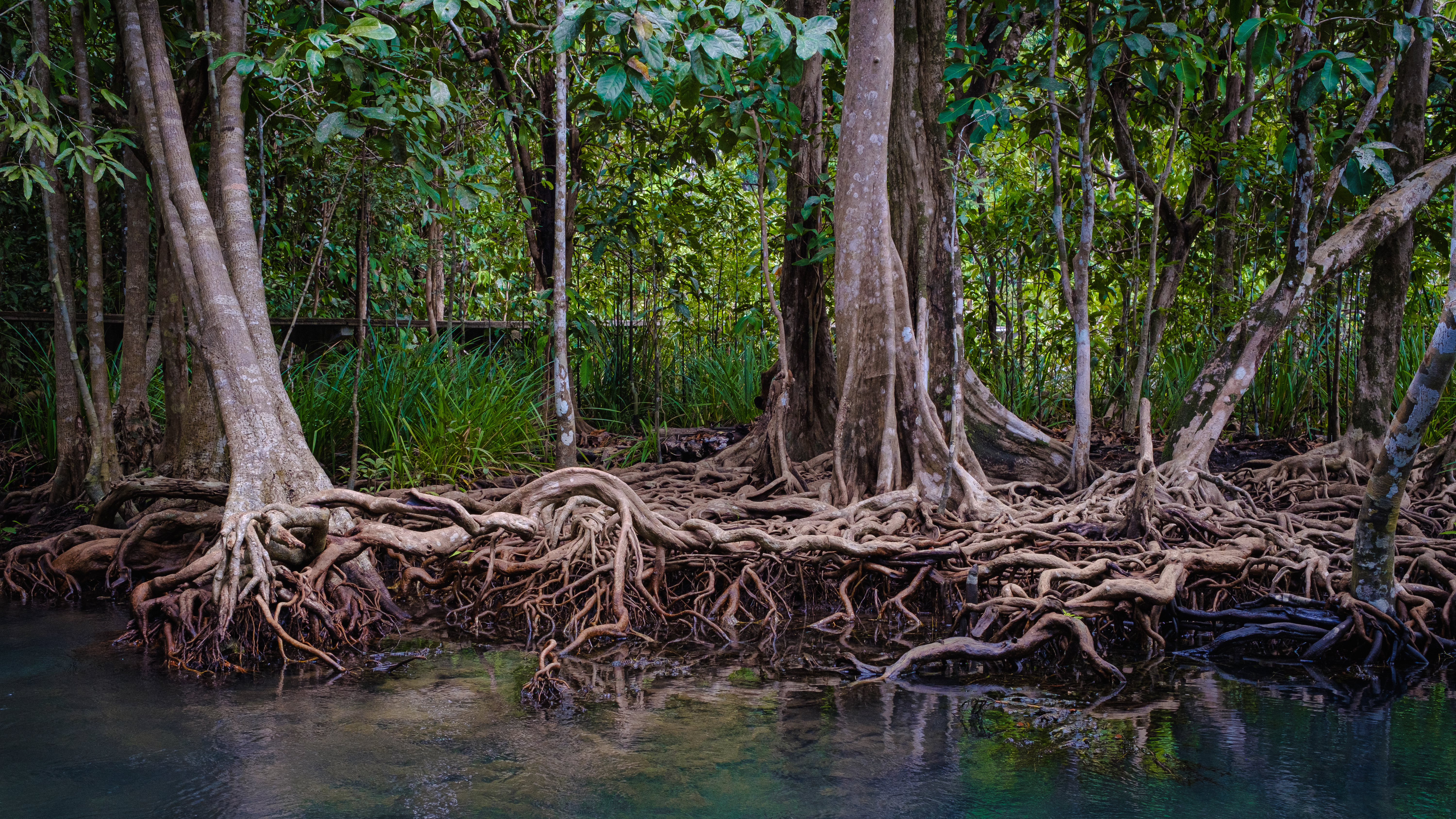 Support WBURThe Mighty MangrovePlay12:11Download AudioOctober 15, 2021Maria GodoyBerly McCoyfacebookEmailThe roots of mangrove trees grow above and below the water's edge. (Getty Images)