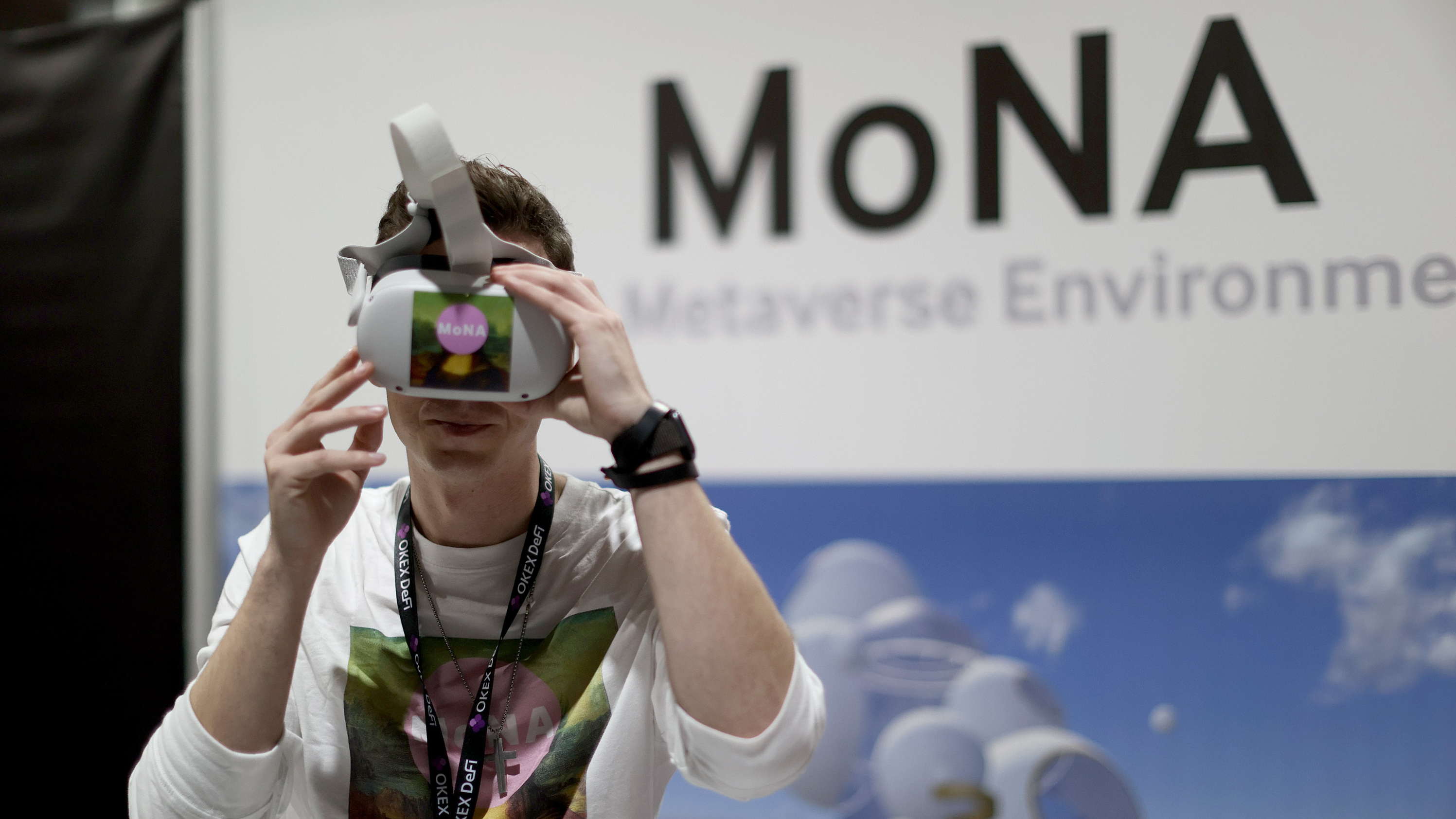MIAMI, FLORIDA - DECEMBER 01: Matthew Hoerl of MoNA Gallery wearing a VR headset at the DCentral Miami Conference. Organizers say this is the largest in-person combined NFT and DeFi conference in history, and includes the MoNA Gallery that describes itself as seeding the open metaverse through the creation and use of unique 3D spaces. (Getty Images)