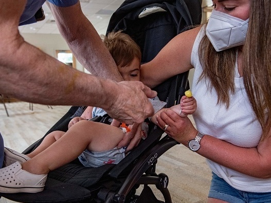 A mother holds her 1-year-old son as he receives the child Covid-19 vaccine in his thigh at Temple Beth Shalom in Needham, Mass., on June 21, 2022. The temple was one of the first sites in the state to offer vaccinations to anyone in the public. (AFP via Getty Images)
