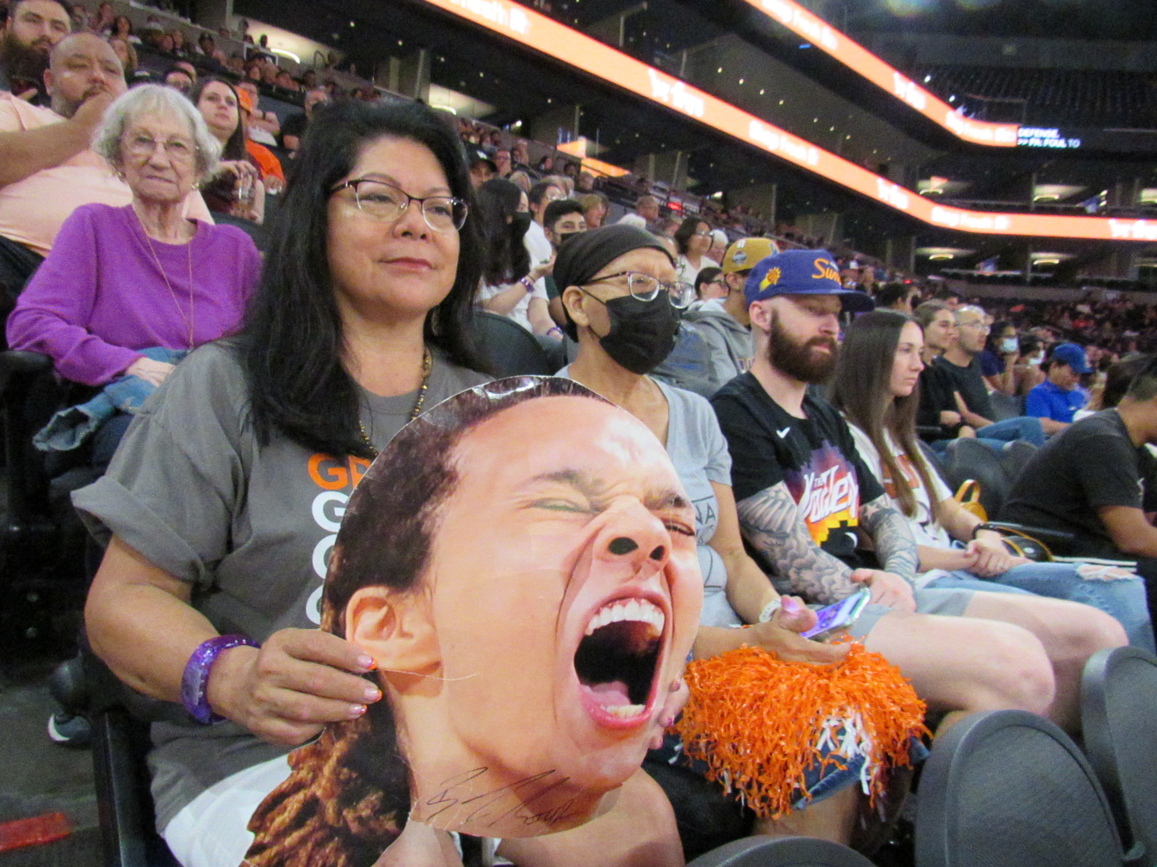 Support WBURPhoenix Mercury fans long for Brittney Griner's release from Russian captivityMatthew CaseyJuly 30, 2022 ShareMercury season ticket holder Patty Talahongva holds an autographed picture of Brittney Griner while watching her WNBA team play in a crucial home game. (Matthew Casey/KJZZ)