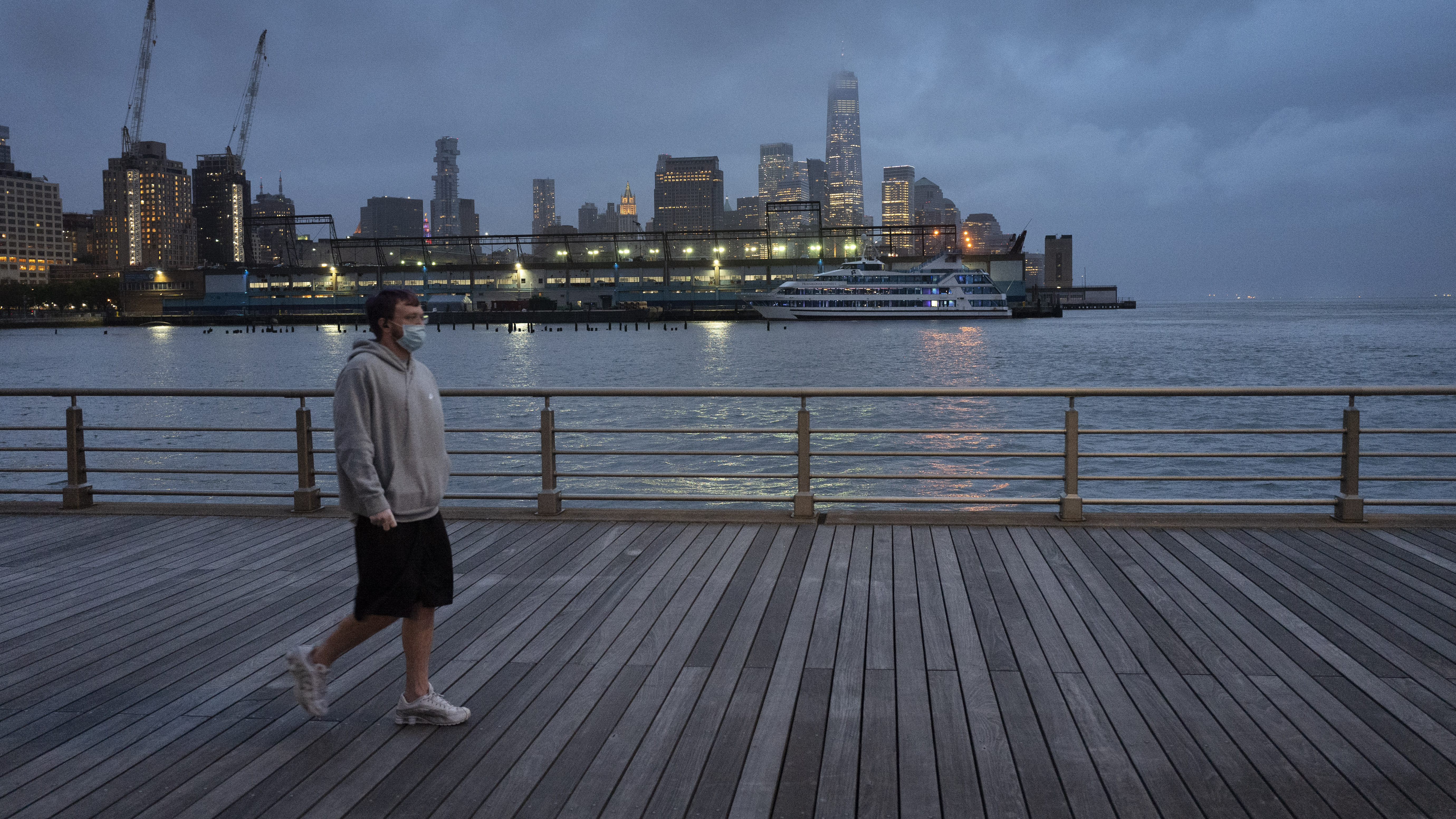 A man wears a face mask as he walks on Pier 45 in Hudson River Park in New York. The coronavirus pandemic has taken a harsh toll on the mental health of young Americans, according to a new poll that finds adults under 35 especially likely to report negative feelings or experience physical or emotional symptoms associated with stress and anxiety. (AP Photo/Mark Lennihan, File)
