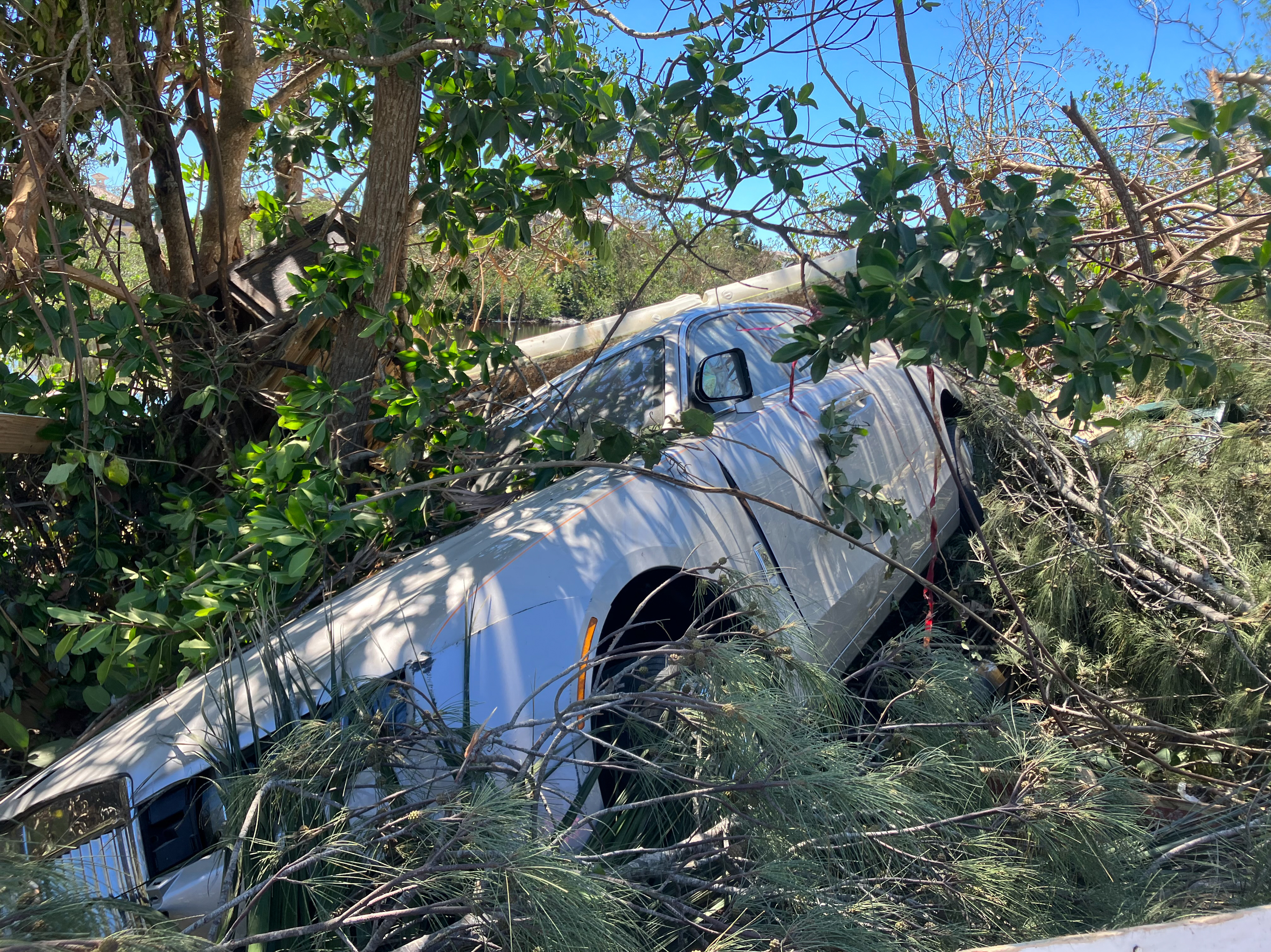 Support WBURIn the wake of Hurricane Ian's destruction, Floridians are picking up the piecesPlay03:48Download AudioScott NeumanMartin KasteOctober 01, 2022 ShareA Rolls Royce swept into the mangroves in Bonita Springs, south of Cape Coral, on Sept. 30, 2022. (NPR)