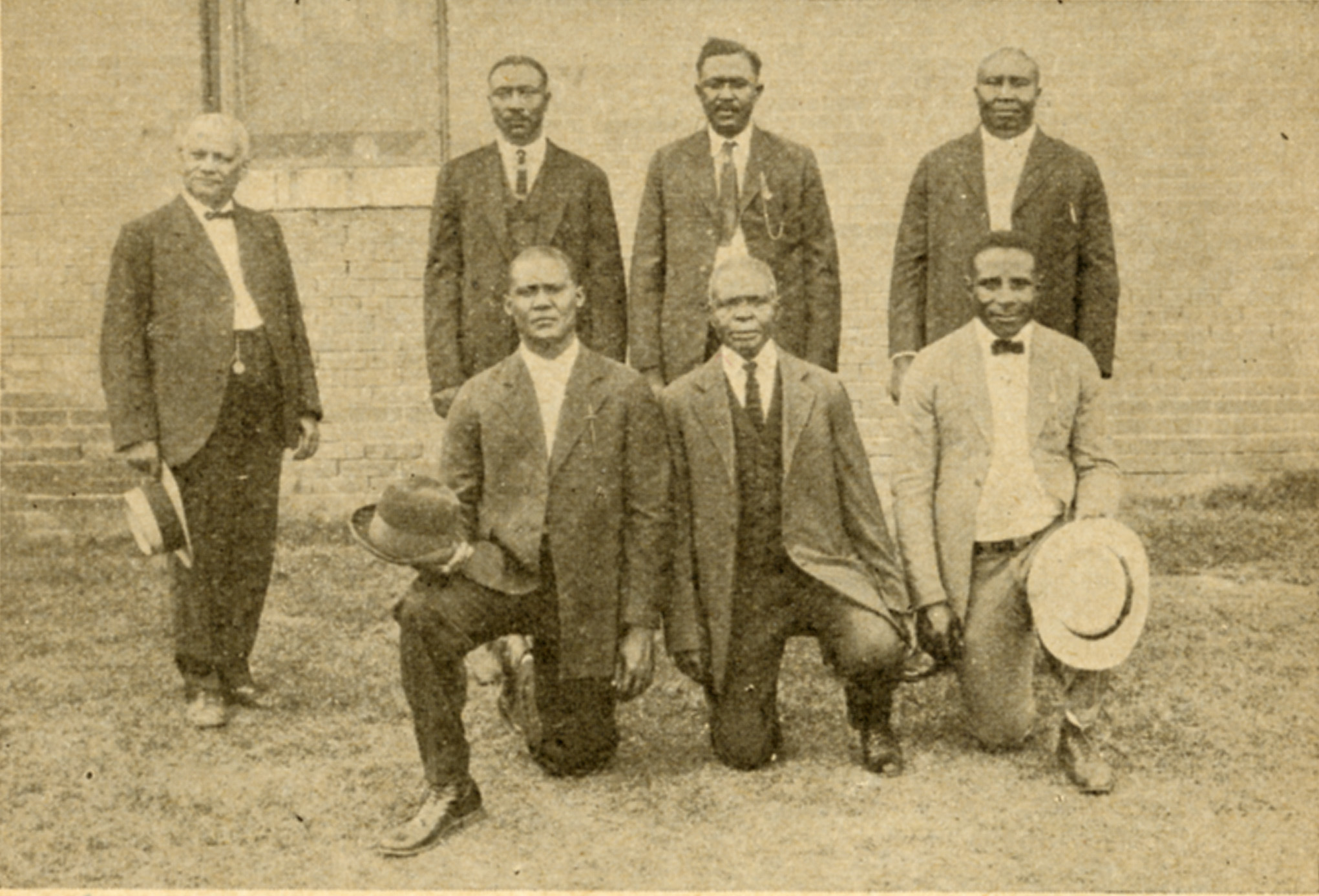 A dozen Black men were convictedof murderby all-white juries in connection with the 1919 massacre in Elaine, Ark. Above, defendants S.A. Jones, Ed Hicks, Frank Hicks, Frank Moore, J.C. Knox, Ed Coleman and Paul Hall with their attorney at the state penitentiary in Little Rock in 1925 after the Supreme Court overturned their convictions. (Butler Center for Arkansas Studies, Central Arkansas Library System)