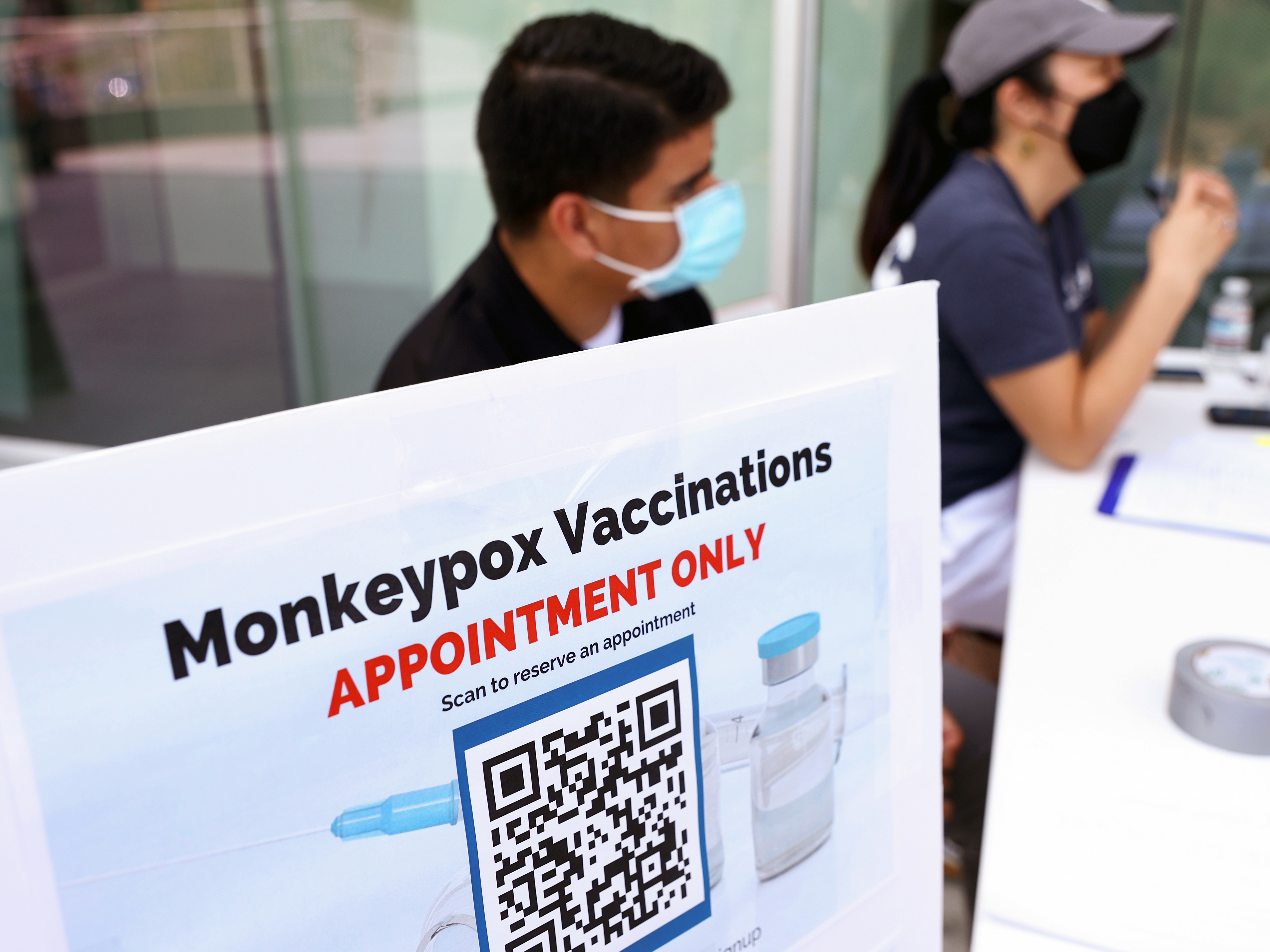 Health workers sit at a check-in table at a pop-up mpox vaccination clinic which opened today by the Los Angeles County Department of Public Health at the West Hollywood Library on August 3, 2022 in West Hollywood, California. California Governor Gavin Newsom declared a state of emergency on August 1st over the mpox outbreak. (Getty Images)