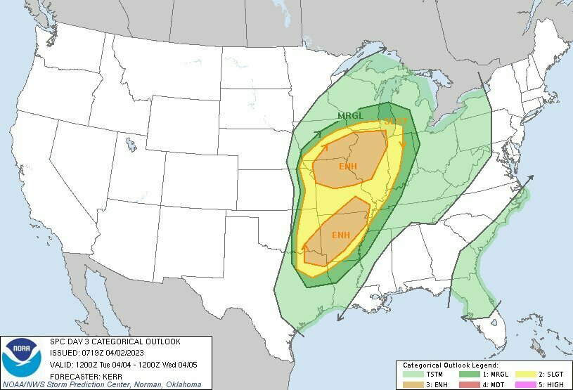 Support WBURMore storms and tornadoes have been forecast for the Midwest and SouthJaclyn DiazApril 03, 2023 ShareMore severe weather is forecast for much of the Midwest and southern United States just days after tornadoes left devastation in many of the same communities. (NOAA/NWS Storm Prediction Center)