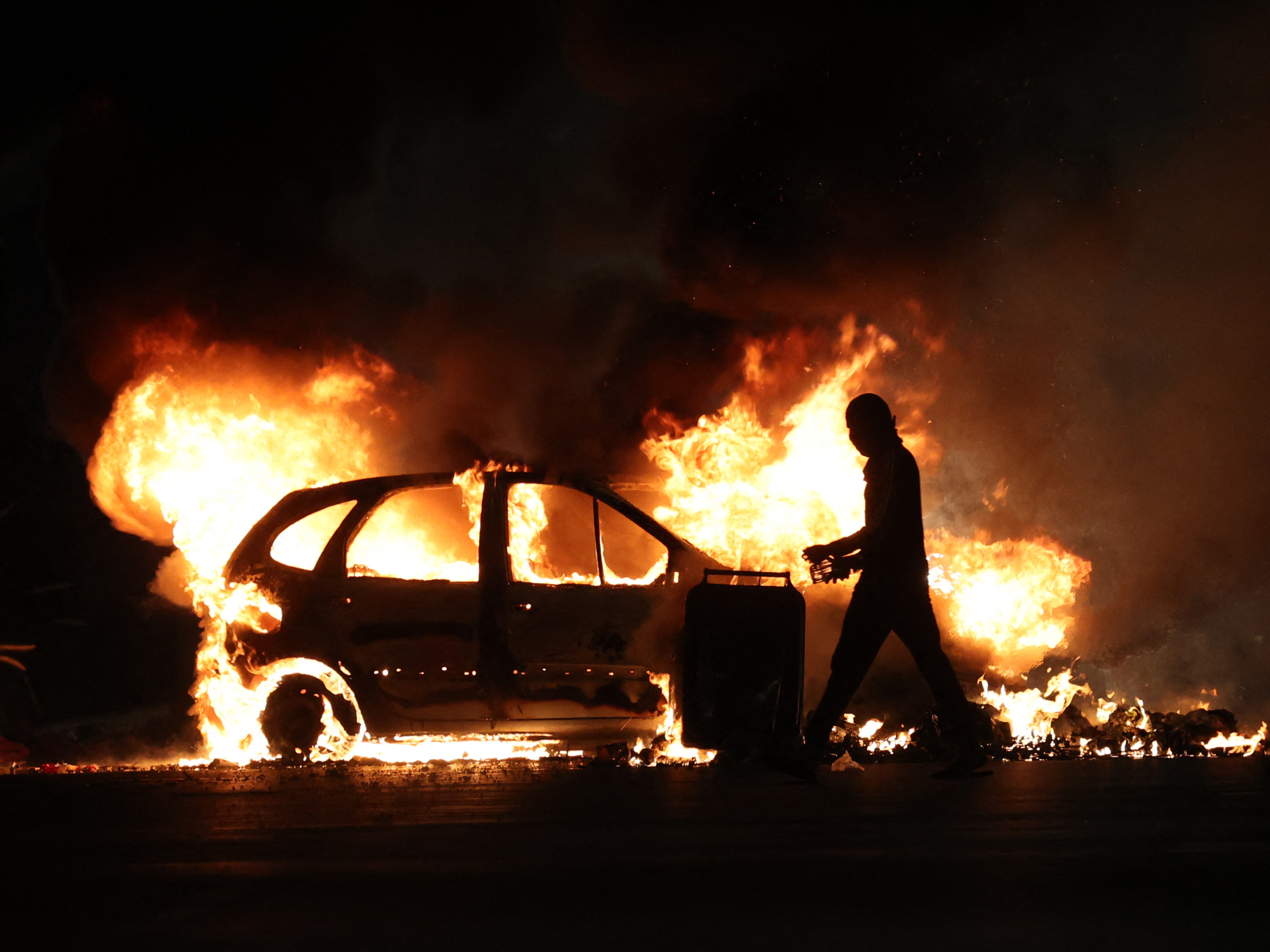 A man walks by a burning car during clashes with police in Le Port on the French Indian Ocean island of La Reunion, on Friday over the fatal shooting by police of a 17-year-old in a Paris suburb. (AFP via Getty Images)