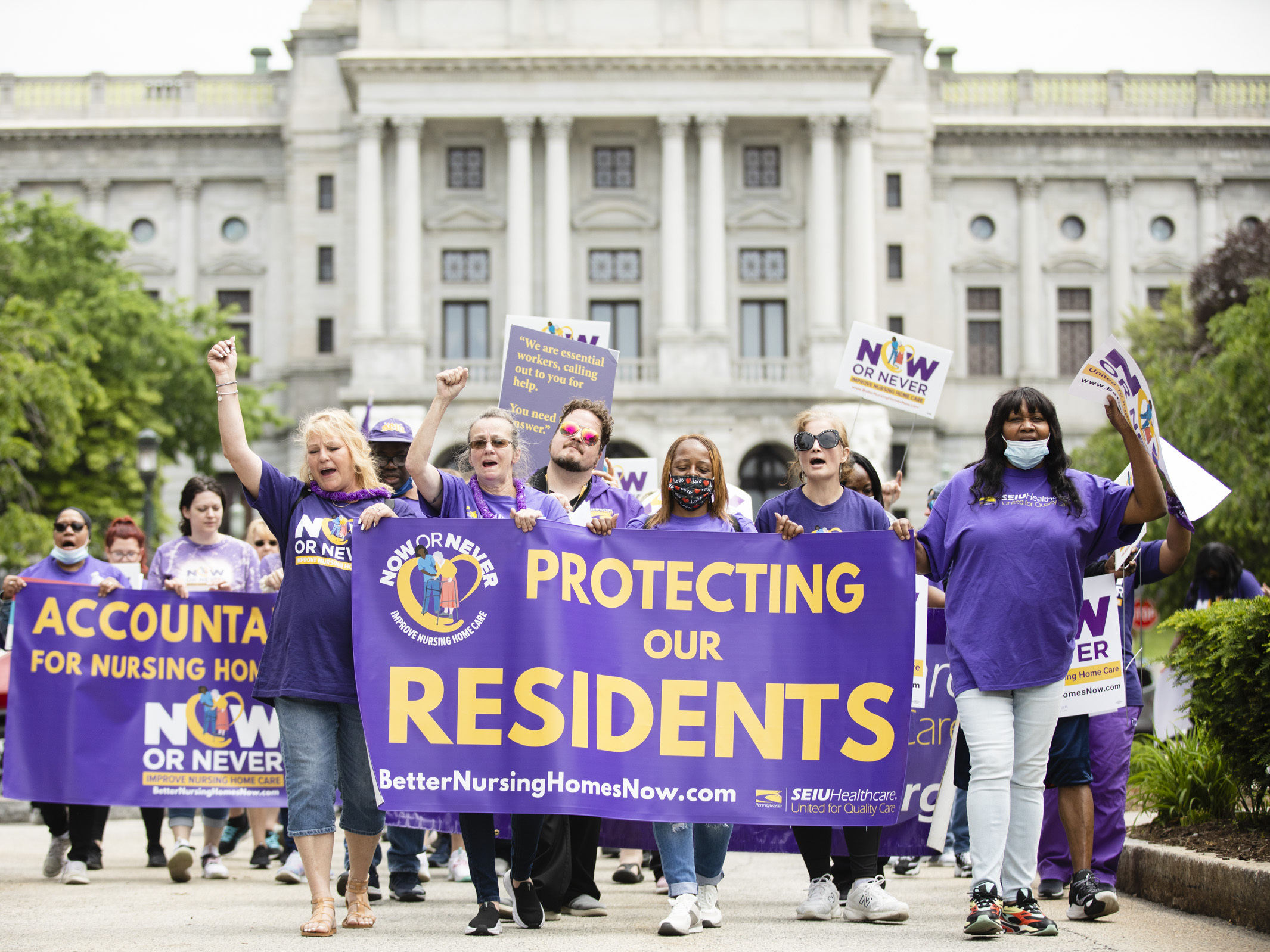 Support WBURLabor unions praise Biden's plan to boost staffing at nursing homesSelena Simmons-DuffinDiane WebberSeptember 01, 2023 ShareSEIU nursing home workers rally outside Pennsylvania's capitol in Harrisburg in 2022. The union is praising a proposed rule released Tuesday that would increase staffing levels. (SEIU Healthcare Pennsylvania)