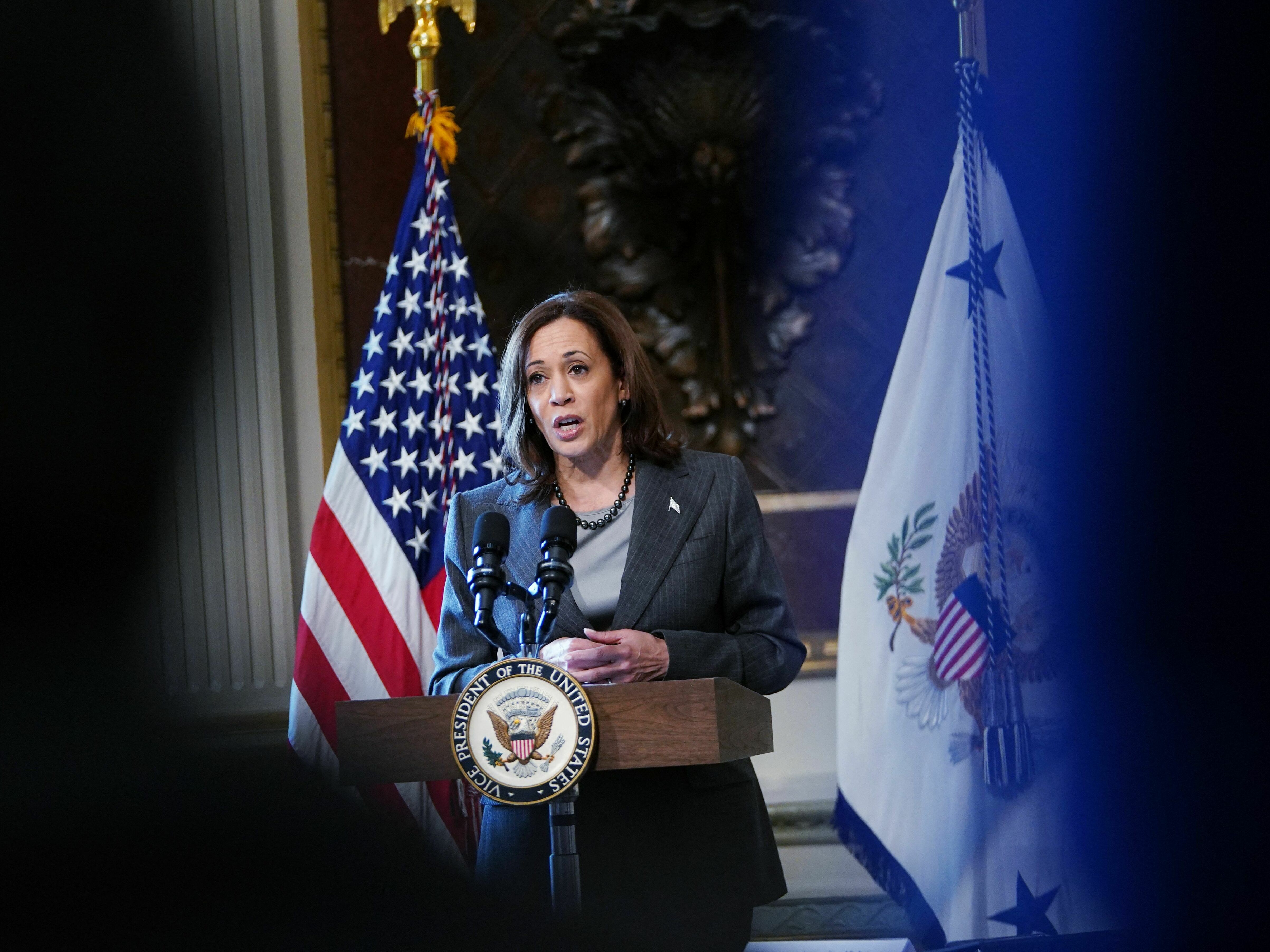 US Vice President Kamala Harris speaks during a meeting with US government leaders and private sector representatives to address the root causes of migration from northern Central America. (AFP via Getty Images)