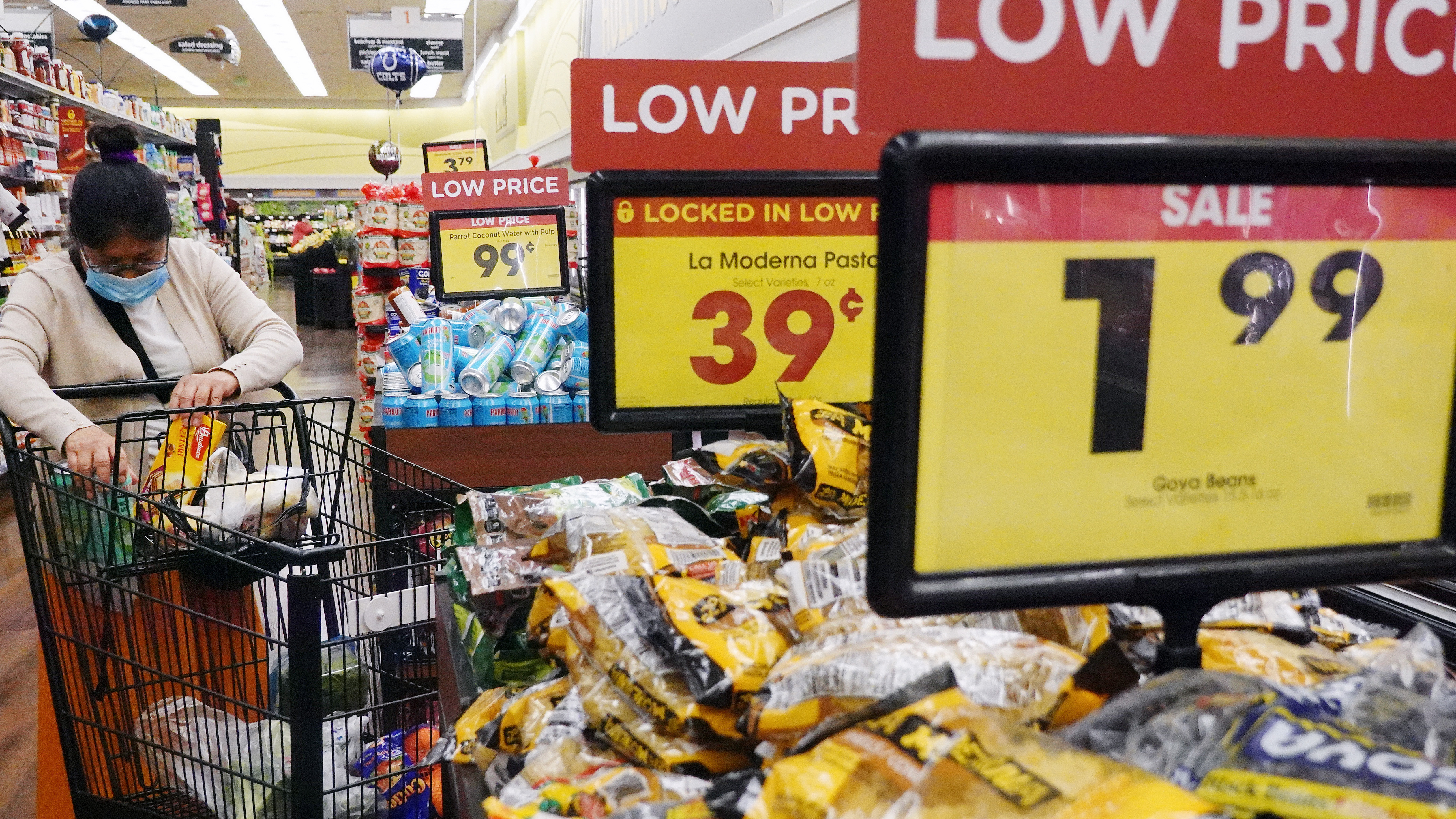 Support WBURAnalysisThe economy is a trouble spot for Biden despite strong signs. Here's whyDomenico MontanaroDecember 09, 2023 ShareA shopper fills her cart in a grocery store in Los Angeles. Inflation has made the cost of groceries jump, but some prices have started to level off. (Getty Images)