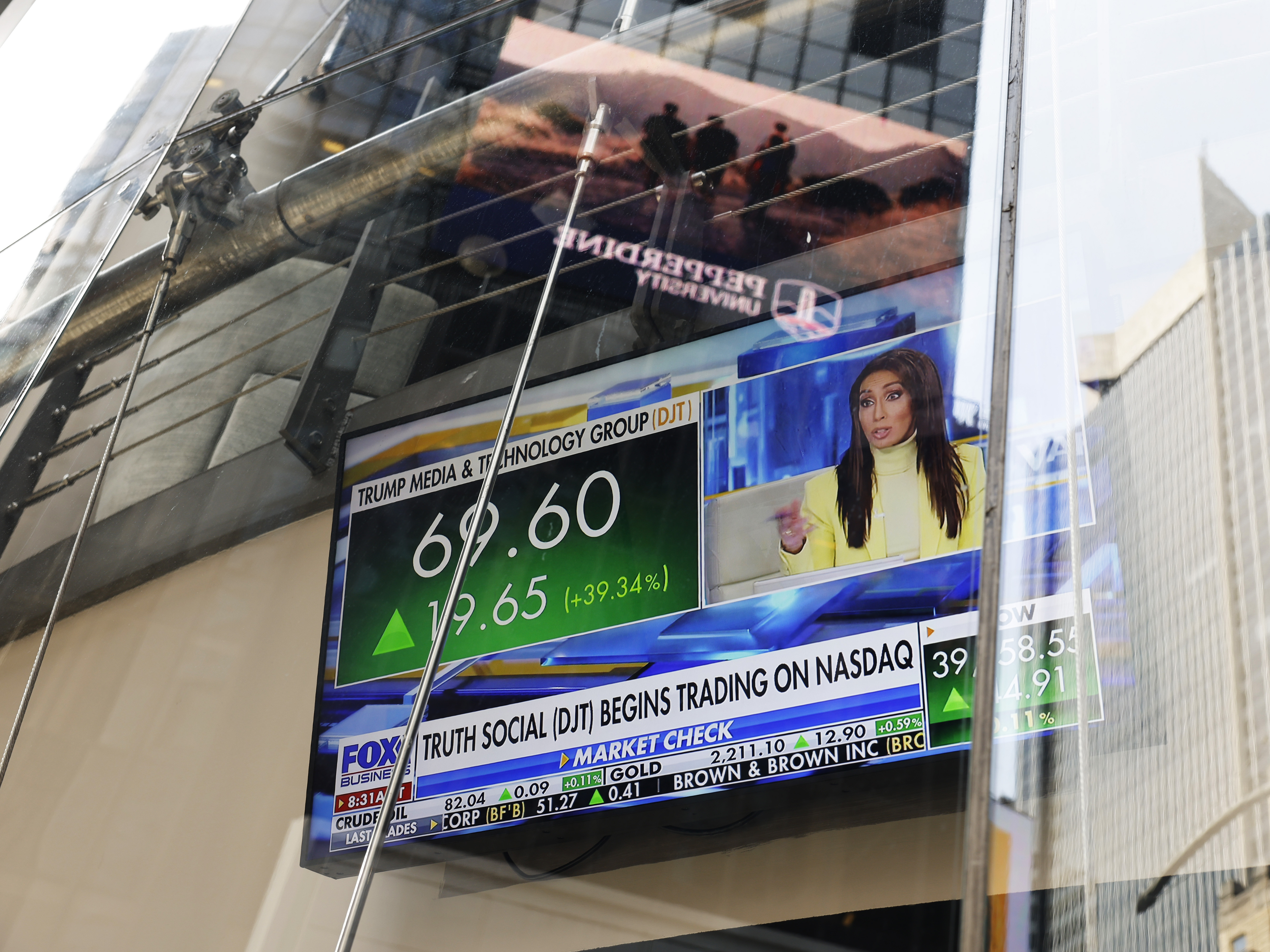 Support WBURTrump's social media stock tumbles, erasing early gainsScott HorsleyApril 01, 2024 ShareStock in the parent company of Donald Trump's social media company fizzled on Monday, reversing last week's big gains. (Getty Images)