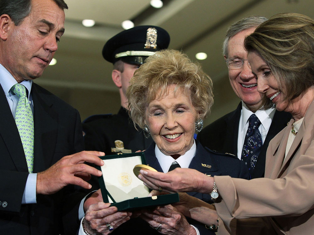 Support WBURWWII Female Pilots Honored With Gold MedalPlay02:14Download AudioMarch 10, 2010facebookEmailWASP Deanie Parrish accepts the Congressional Gold Medal from House Minority Leader John Boehner, Sen. Harry Reid and House Speaker Speaker of the House Nancy Pelosi during a ceremony at the Capitol. (Getty Images)